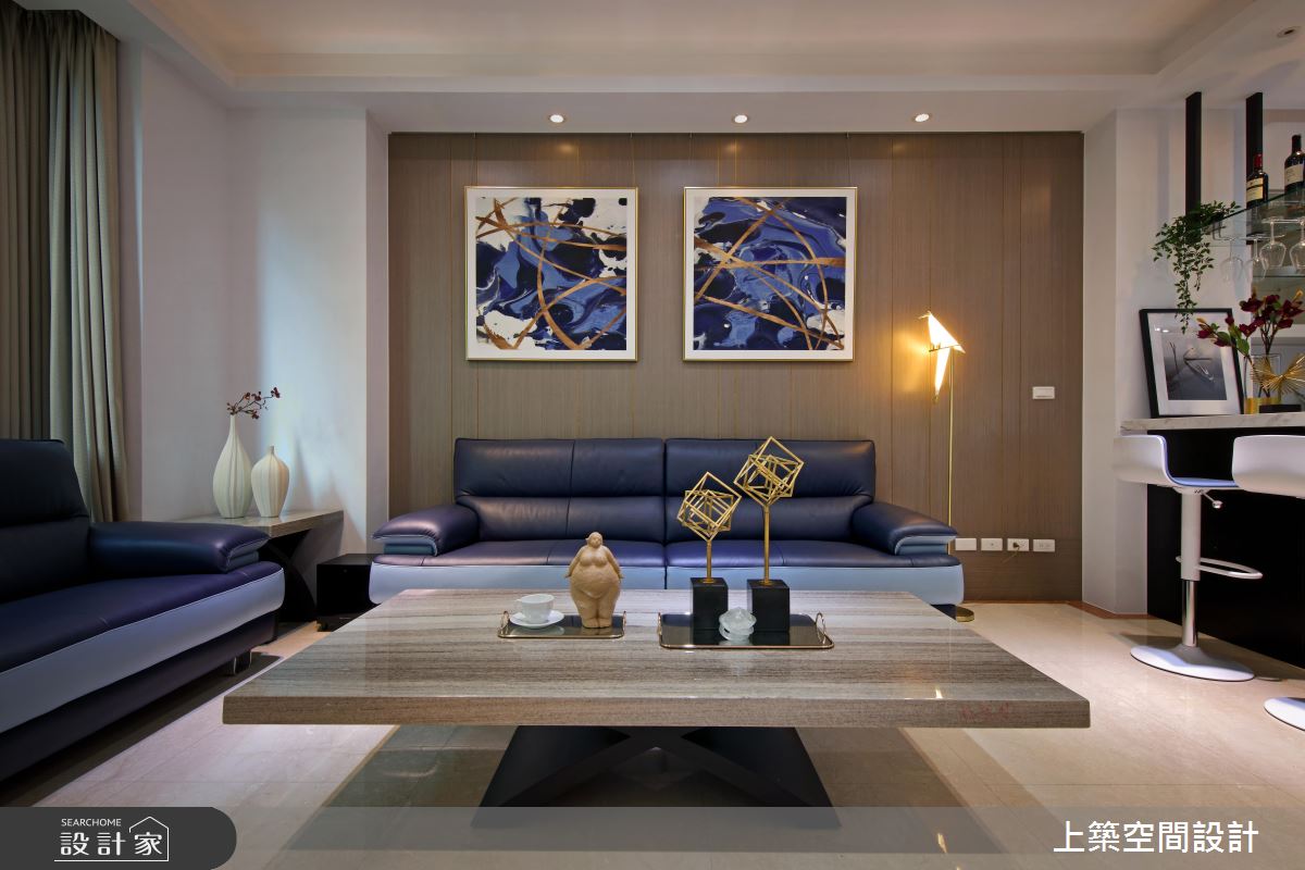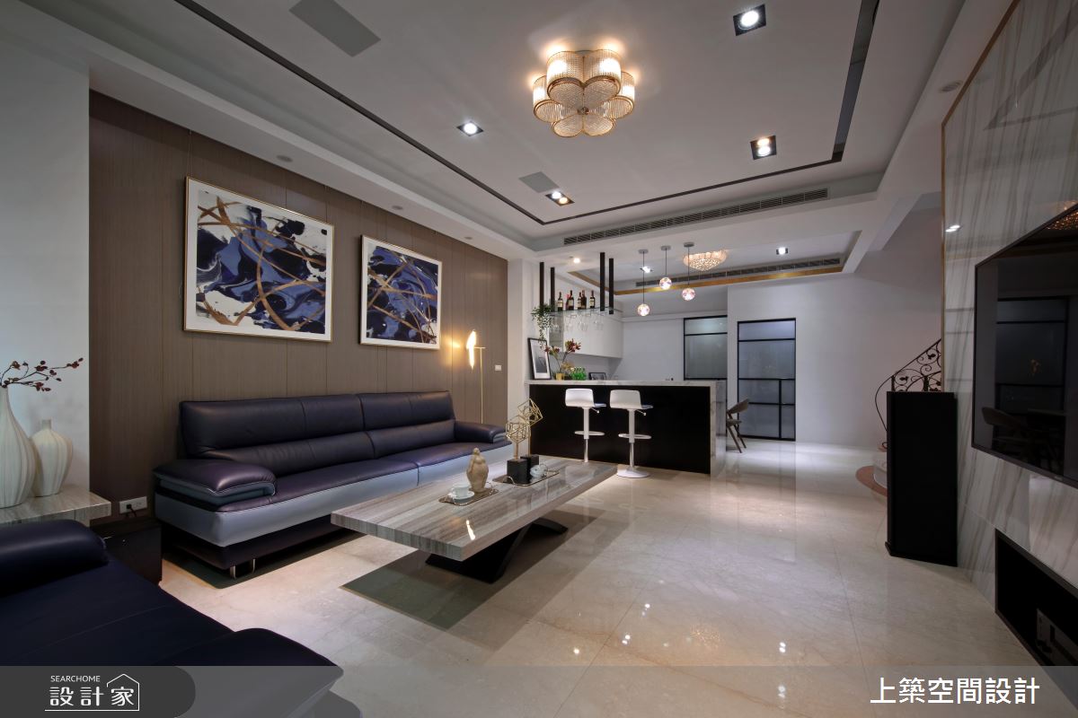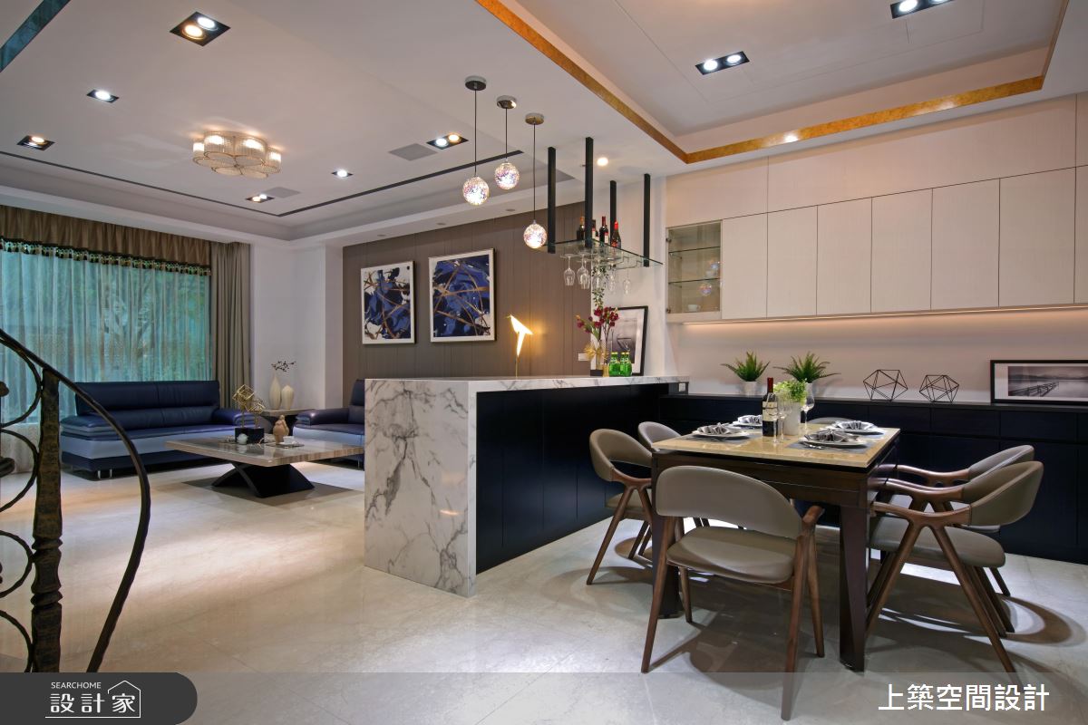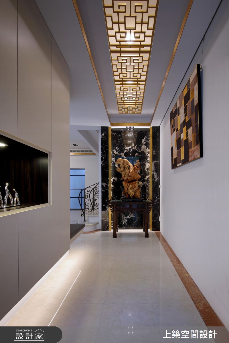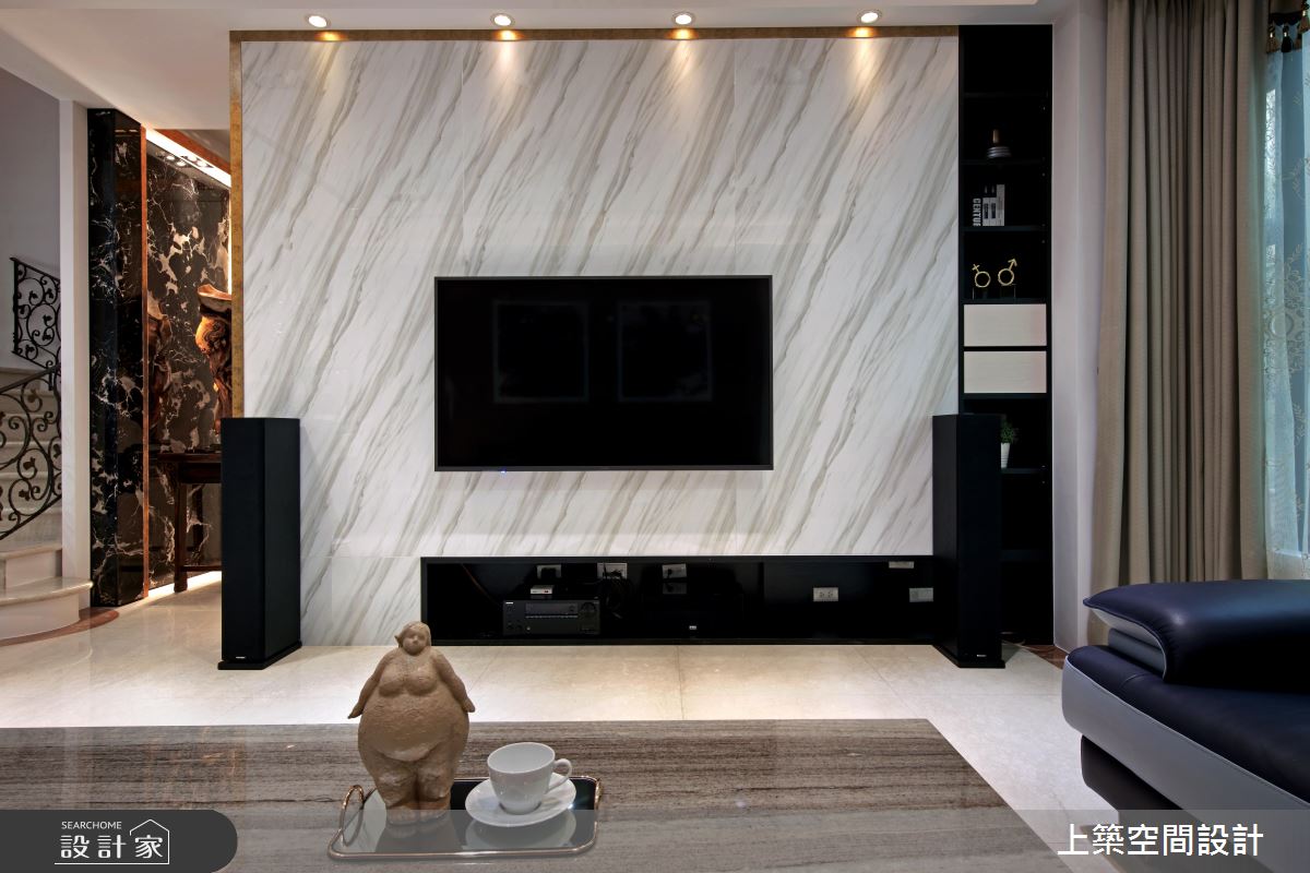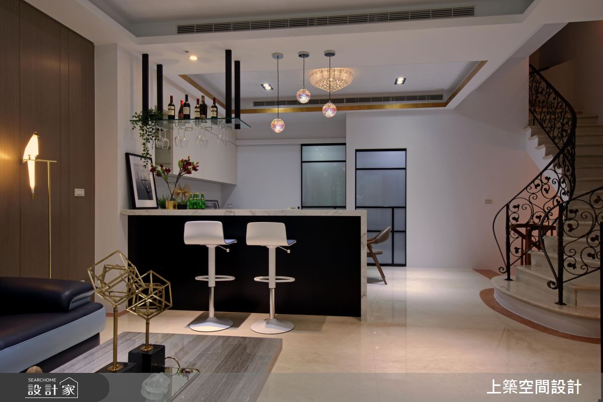 玄關處,巧用電視牆劃分開放式場域,落塵範圍清晰,開門見山的疑慮也迎刃而解;廊道視覺末端採以石紋黑牆襯托大型工藝品,展現屋主個人收藏及品味,而遊走於天壁之間的金色框線,勾勒出完整的尊榮感受。公共空間安排在採光優秀的一樓,屏除傳統隔間思維,利用中島吧檯作為格局分界,用餐時能共享落地窗外的綠意光景,人數較多時能視為一體,提供賓主盡歡的聚會空間;用色單純以凸顯材質特色,例如,純白石紋包覆電視牆與中島檯面的設計,與黑色收納呈現強烈對比,浪漫氛圍中帶出經典時尚美學。