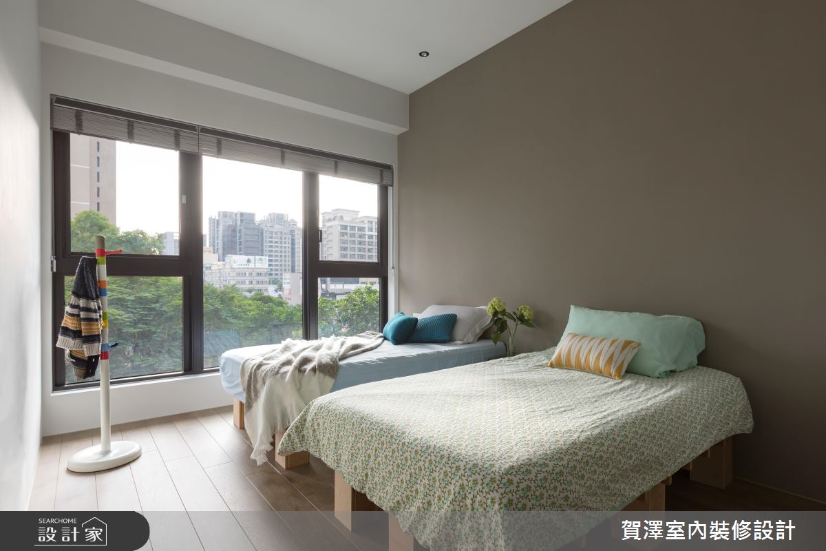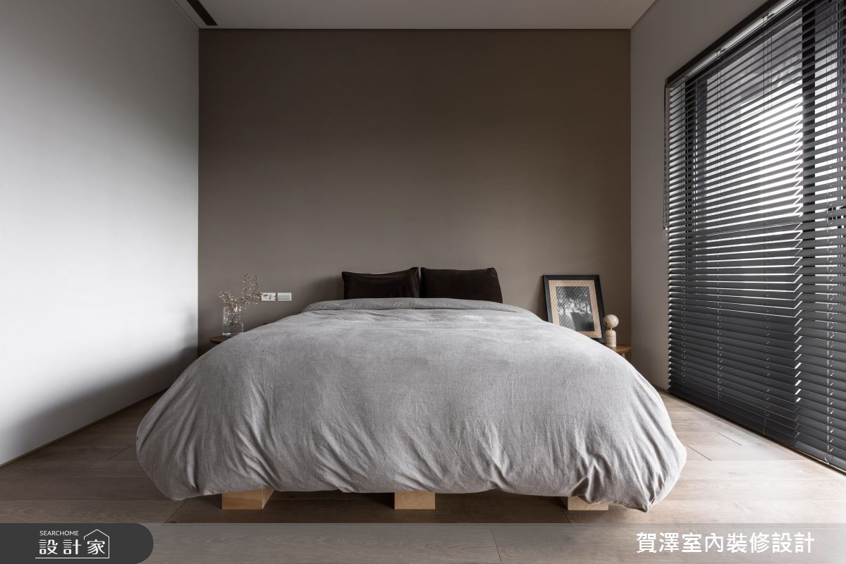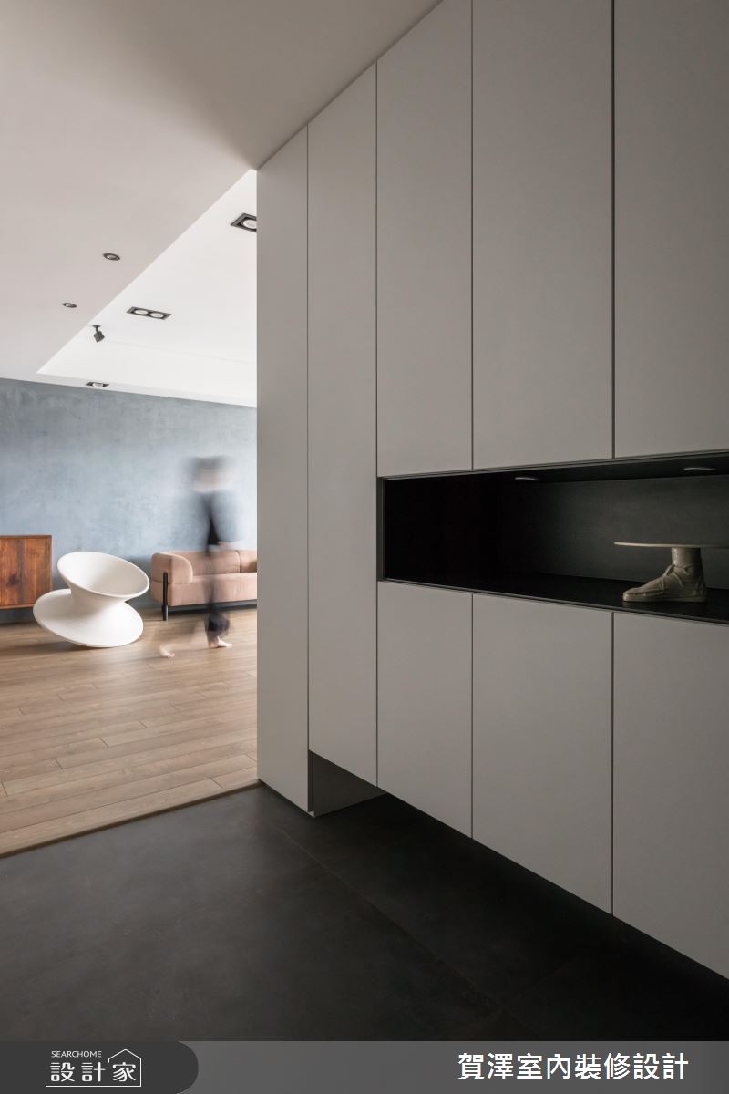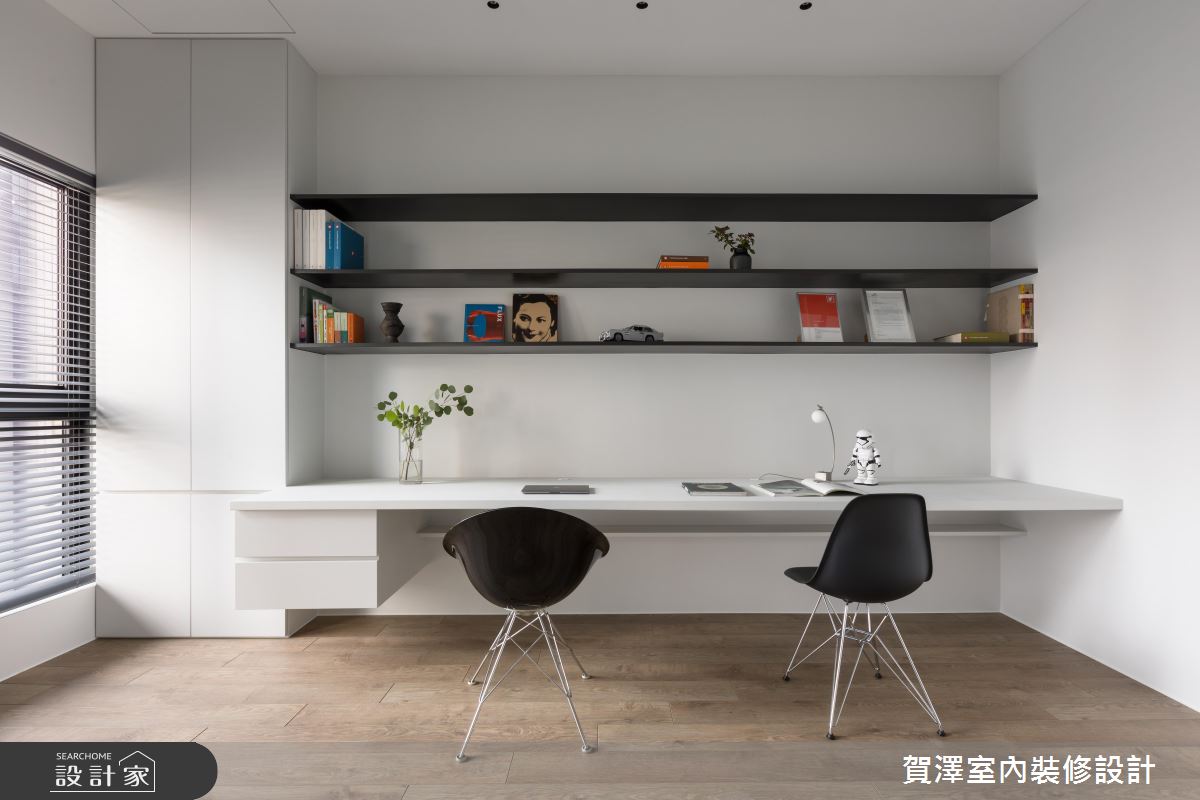 玄關廊道鋪上仿舊氧化灰磚,導引視線由暗處迎向純白敞亮室內,透過大樑延長空間感,讓視線底端落在兼具客廳收納的藝術端景面。公領域一覽無遺的綿白色收納櫃,以有秩序的整齊切割、部分鏤空手法,營造有層次的大容量收納。設計師考量原廚房位置優勢,解構格局打開牆面,客、餐、廚串聯放大公領域幅度,同時保留廚房獨立感。書房兩行黑色輕量層架,為典藏書籍打造個性化收納,或站或躺的書本,讓平凡的白色空間化身迷你畫廊。私領域極簡卻不馬虎,簡約有力的特色木床架,配上相應的大地色牆面、柔和色寢具,在極簡設計與紓壓氛圍間取得平衡。