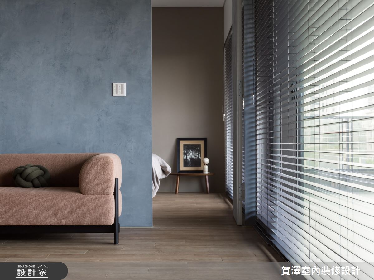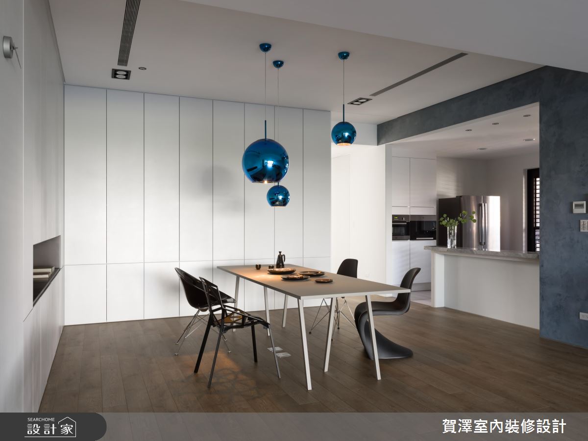 設計師首先以個性黑椅佐銀灰長餐桌,搭襯北極藍懸吊燈,創造精采的藝術焦點!接著透過客廳一道手抹感紋理藍牆,與亞麻織布、老木櫃攜手打造溫潤質感,完成設計總監屋主想像中極簡有個性,仍保有生活溫暖的三代同堂宅。