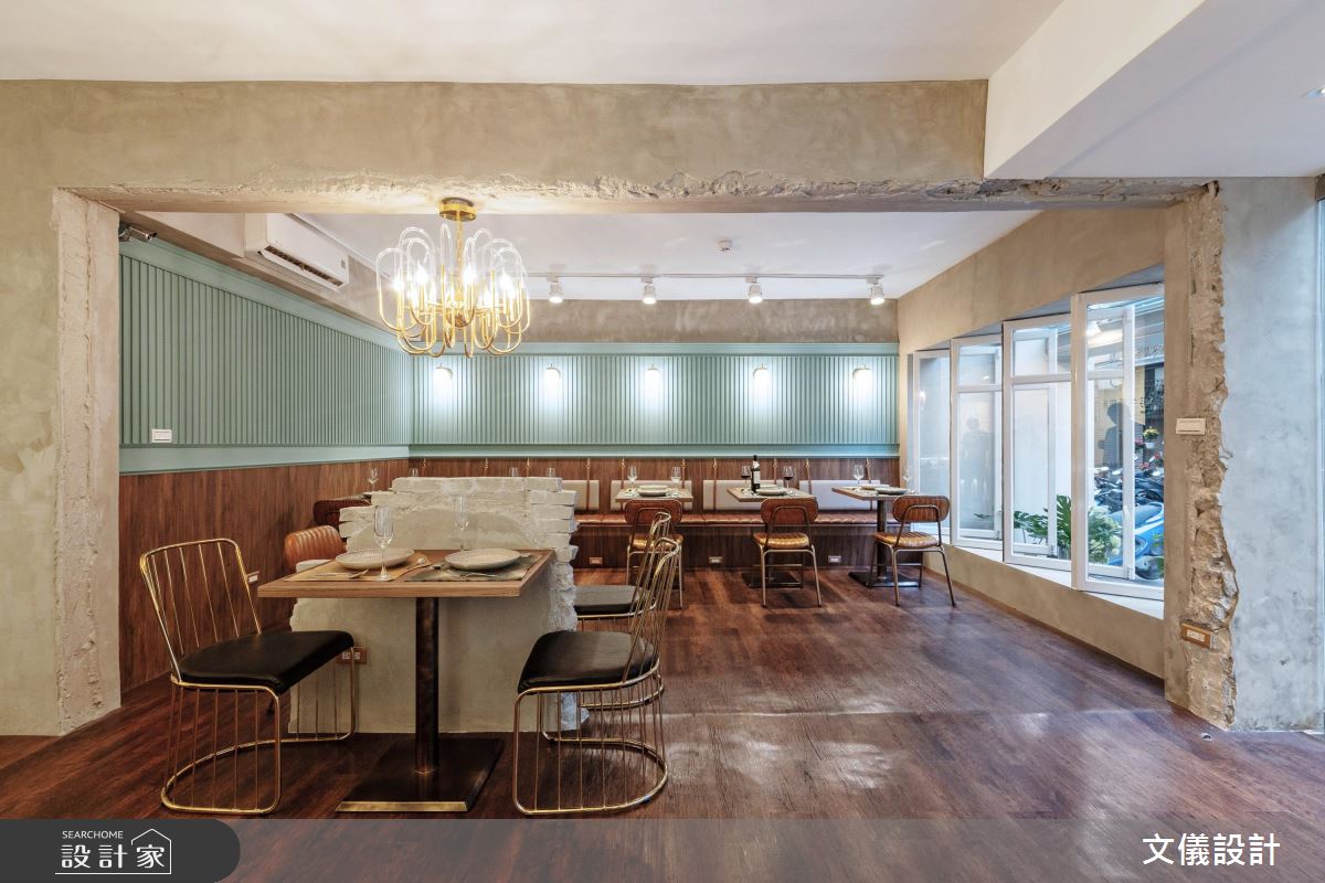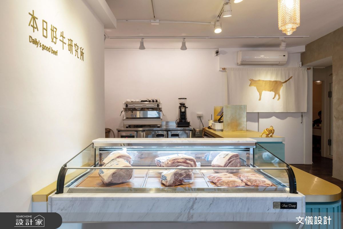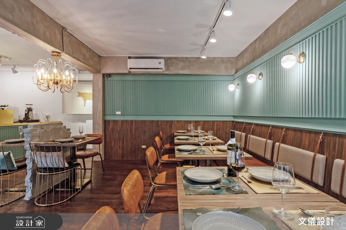 入門處左邊和牛販售區,以 Tiffany 藍櫃台佐一抹白牆,營造與生食品具有反差的簡約清新氣質,比照咖啡廳的甜美用色,傳達品味牛肉的空間,也能清爽不油膩!右側寬敞的沙發區,選用與地坪相似的深咖啡色手工皮革,展現成熟復古韻味,而刻意作舊的大樑、牆面,巧妙成為一道空間分界線,斷垣殘破的意象,與絢麗浮誇吊燈形成衝突美感,堆疊用餐時的奇幻浪漫想像。