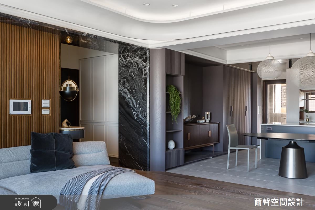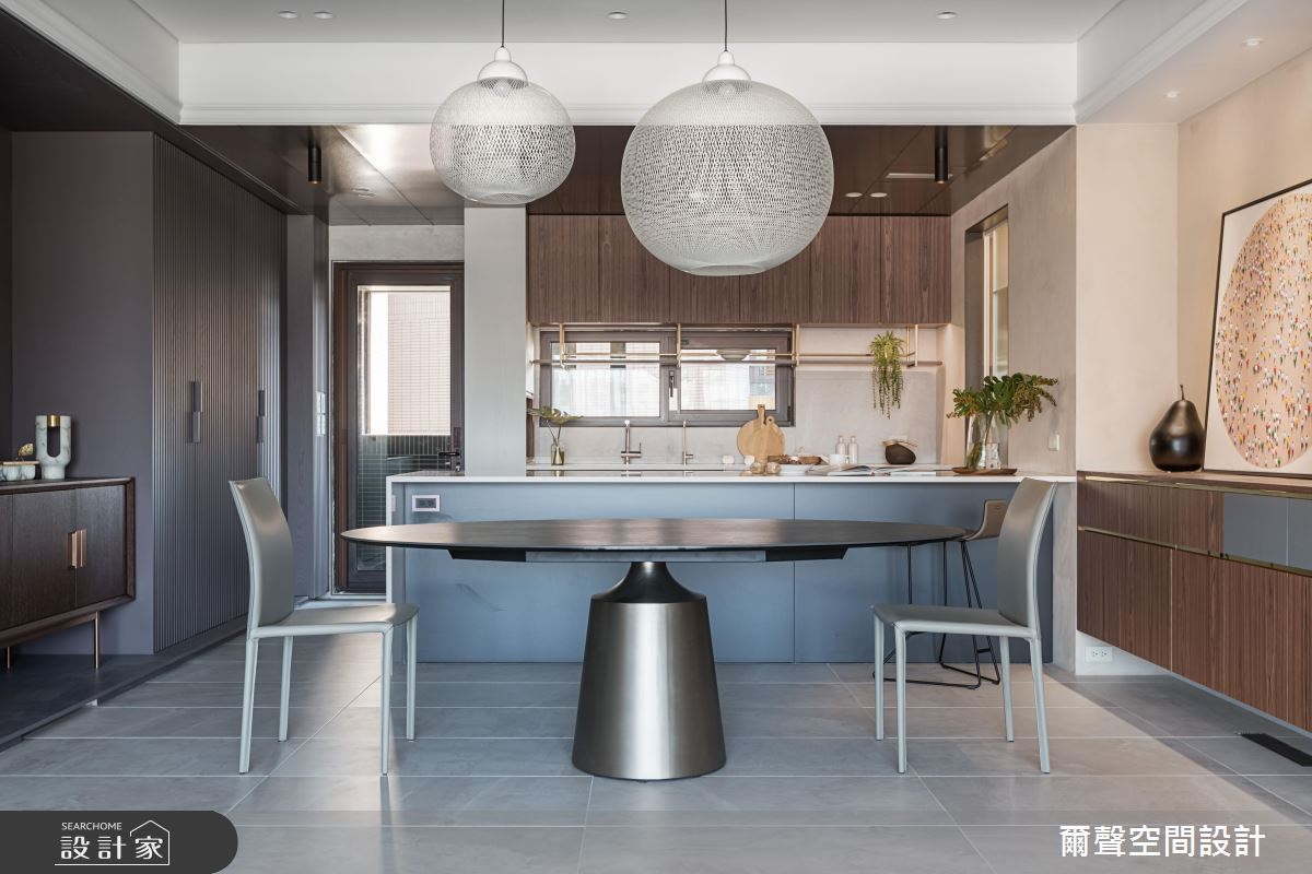 玄關鋪陳深紅色石紋地坪,配合櫃體的白色線板,開啟優雅沉著的居家視野。客廳天花板透過導圓設計,創造空間的立體度,並象徵一家人團聚的幸福意涵。環狀沙發後方的牆面,堆疊溫潤的木格柵元素,提升整體空間的溫度。餐廳則利用銀灰色系的圓桌,與兩盞大型燈飾,塑造略帶奢華的用餐氣氛。
