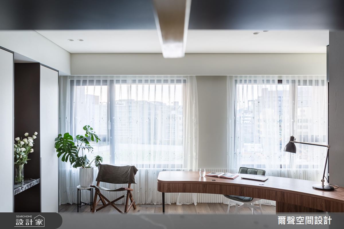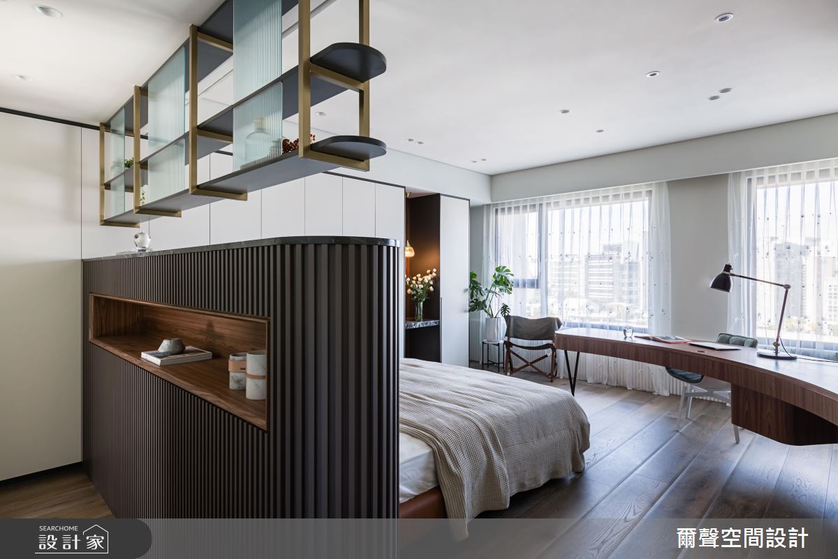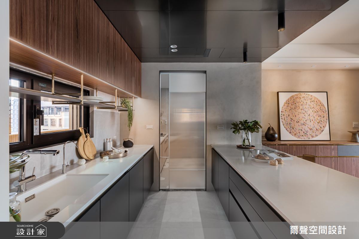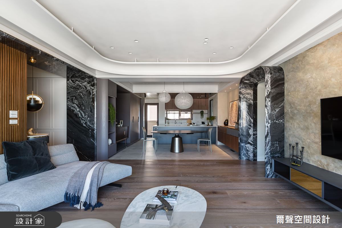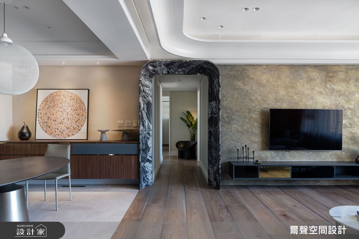 廚房在流理檯上方規劃吊櫃,保持碗盤的通風,又能夠增添機能性,且運用一道玻璃拉門分隔輕食吧檯區和熱炒區,避免油煙且維持開闊感。廊道以深色潑墨山水大理石的圓拱門,定義明確又有氣勢的生活動線。主臥採取圓弧造型的書桌設計,讓空間少了一些銳角,使得居住者能享受舒服的睡眠時光。