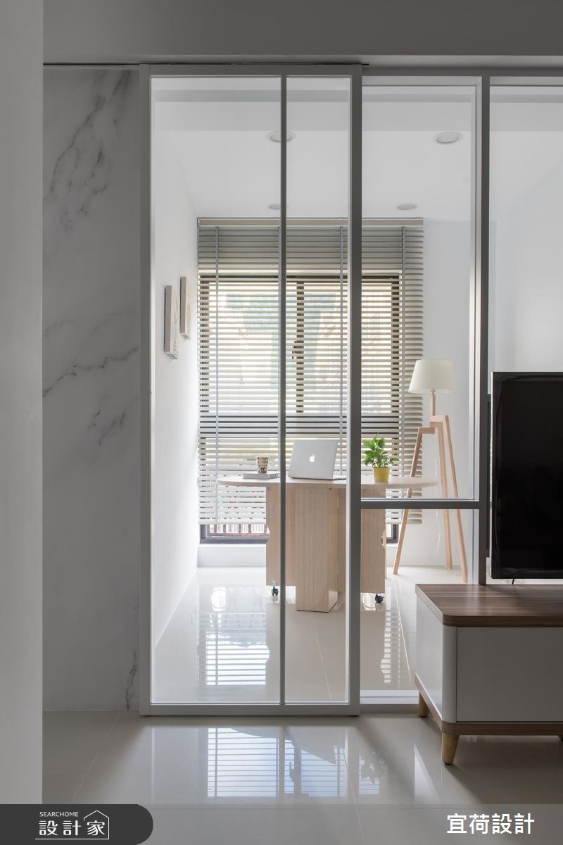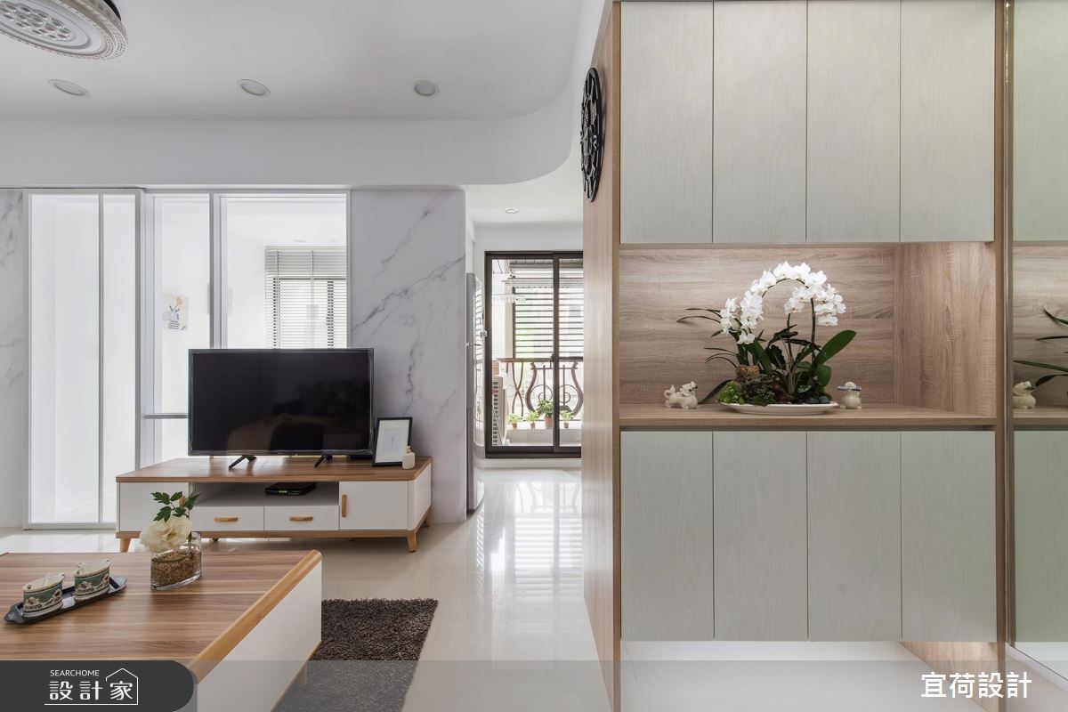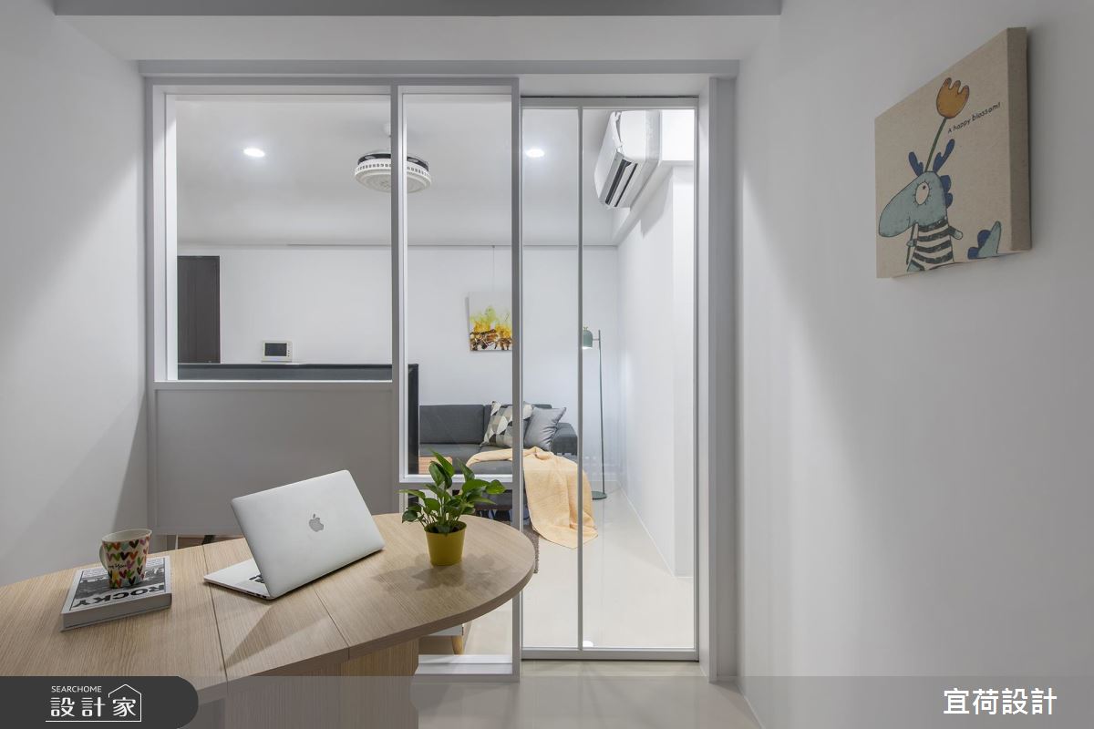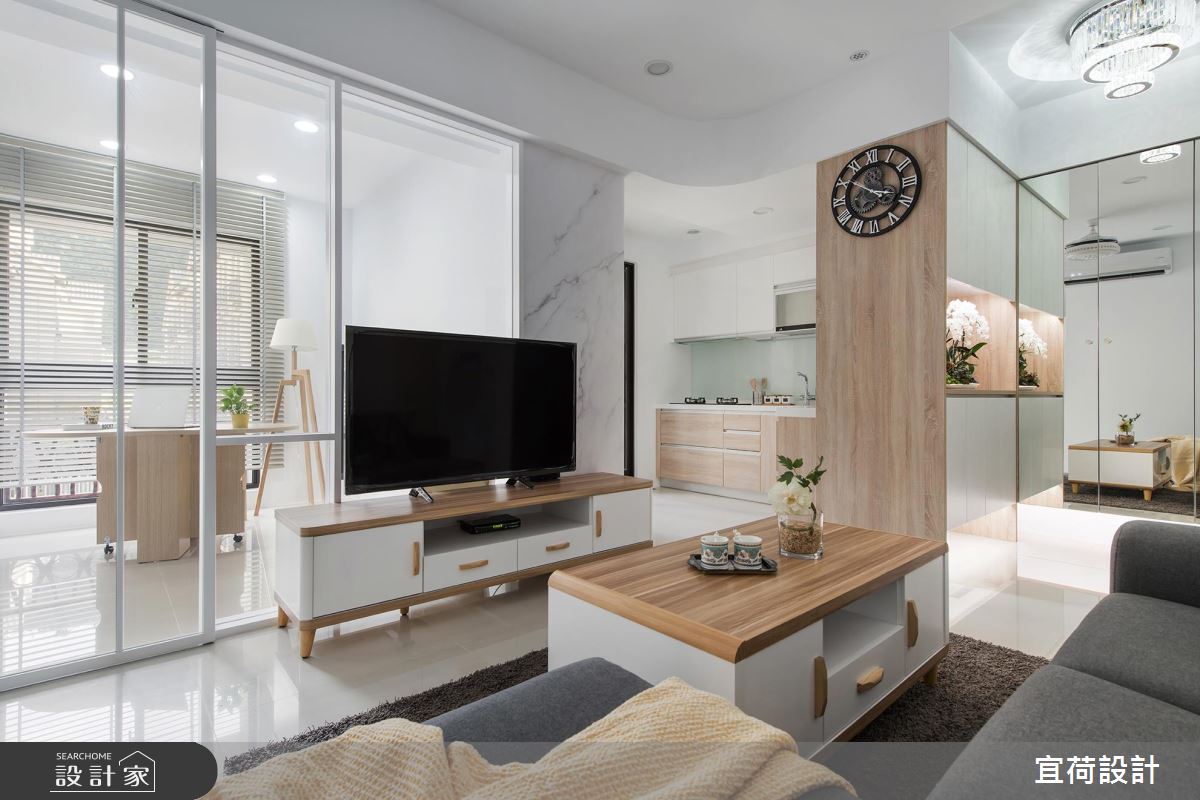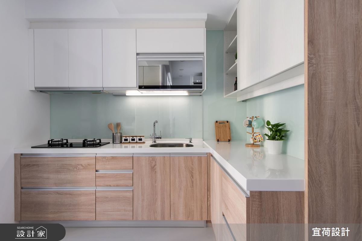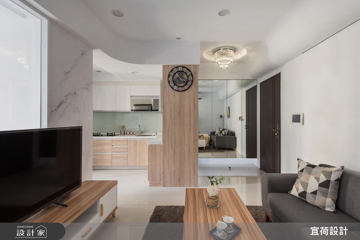 玄關區屋主介意的開門見灶疑慮,設計師以雙面活用的收納櫃化解,省去變更廚房位置的大工程,並為玄關、廚房擴張收納空間。考量公領域的敞亮度,書房隔屏改以清玻璃材質,解構實牆阻斷的視線與光源,讓豐沛採光流入客廳;電視牆選擇以低矮收納櫃取代,不做滿的手法抬升小客廳的視覺高度,並保留視線交流,拉近2人世界的生活距離。開放式 L 型廚房,因位處公領域角落,擁有既開放又獨立的特色,僅透過更換淺木門片的混搭美學,打造一氣呵成的暖木簡約風。