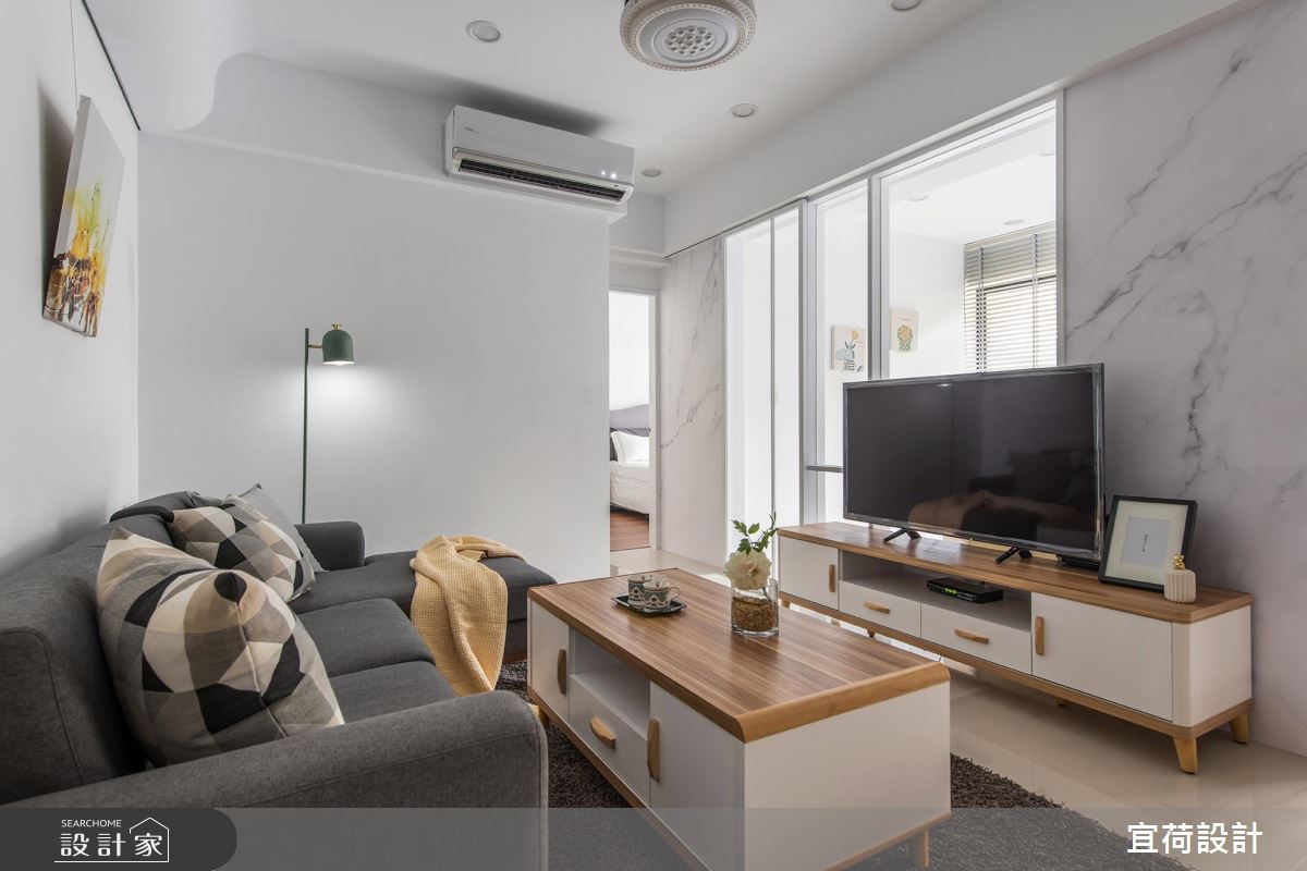 15 坪簡約風新婚宅,以白色底蘊搭配溫潤木紋,構築 2 人世界清新溫暖氣氛。考量新成屋狀況佳但採光不足缺陷,設計師發揮巧思減少格局變更,降低屋主裝修預算,而客製化系統櫃設計,滿足屋主收納需求外,兼具縮短工期的優勢。