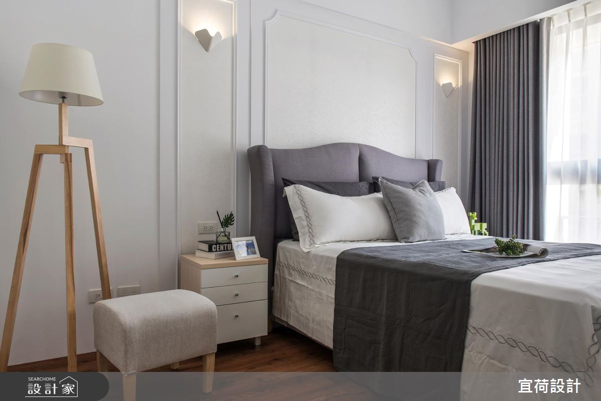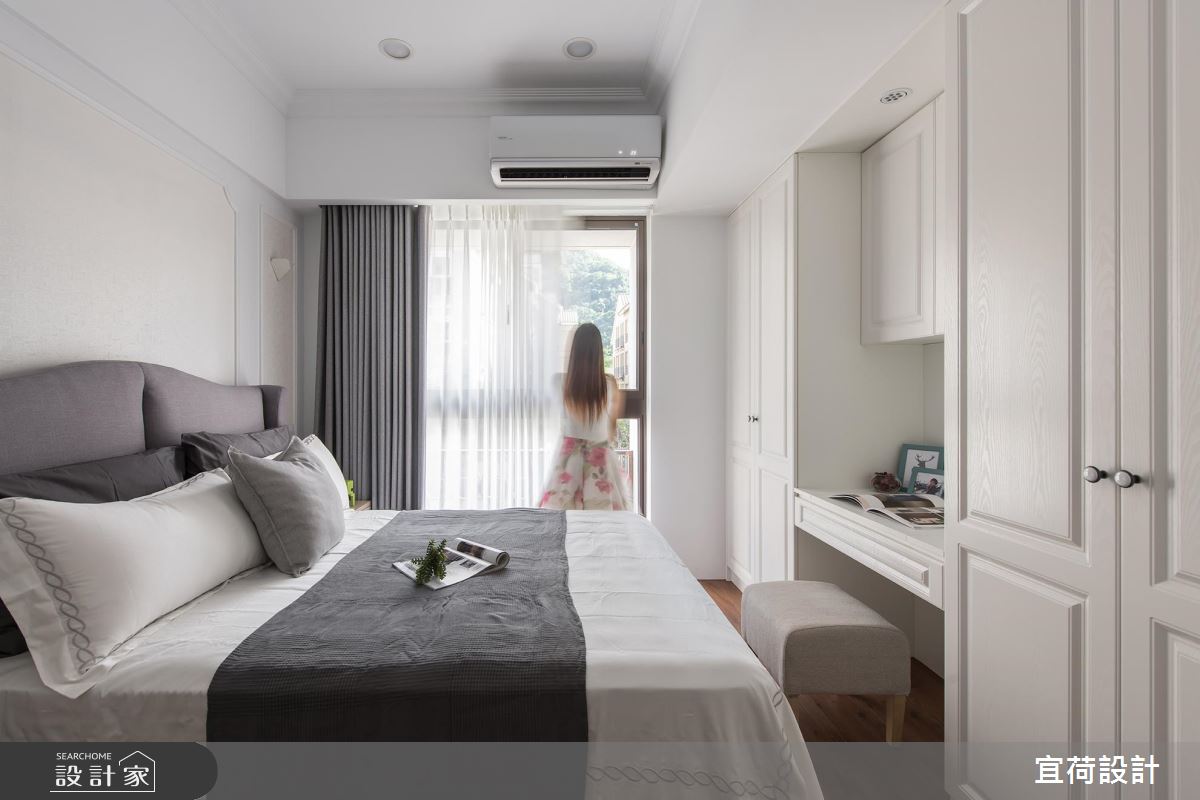 主臥以純白色包覆壁面、收納櫃,佐線板俐落典雅線條、柔和光暈,勾勒浪漫意象;床鋪及書桌化妝區置中設定,讓床頭櫃、衣櫃左右對稱鋪排,以配合夫妻一人一邊使用機能的規劃。
