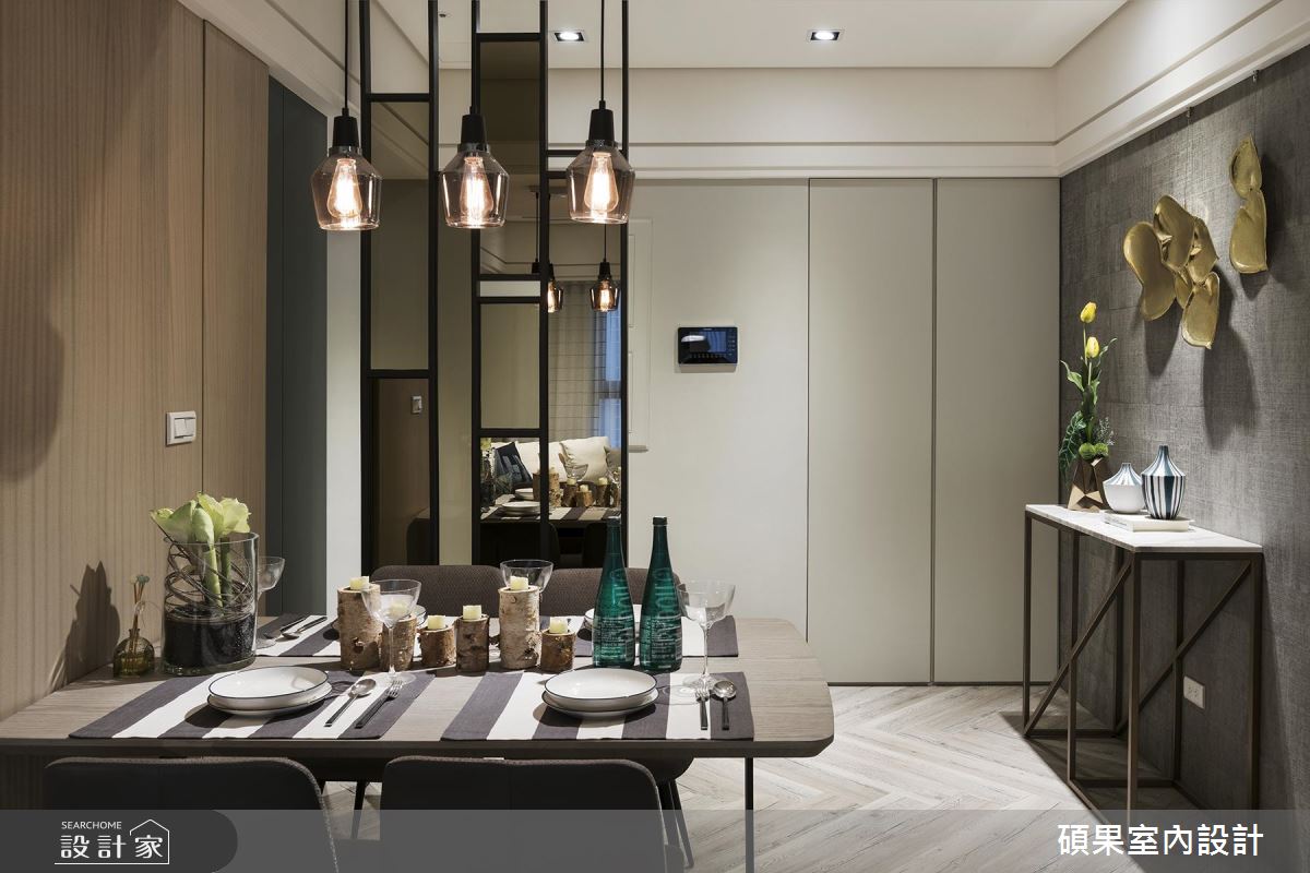 公領域地坪採用木質人字拼,創造和諧美感的視覺印象,客廳則不同於一般電視牆的作法,刻意加入細膩的木質格柵組成表情,營造溫潤輕盈的畫面,沙發牆亦別出心裁地做成磚面紋理,突破一般制式作法,形成耐人尋味的空間景致;餐廳與玄關的過度空間,則配置穿透性屏風,讓視線可無礙遊走,兼具界定與屏障功能,並刻意加入鏡面建材,讓場域達到放大、增加明亮度的效果,再輔以天花板餐吊燈的安排,替餐廳譜出內斂的華麗氛圍;寢臥內,於床頭、櫃體做出線條修飾,在淡雅綠色的輔助之下,形成猶如樹枝綿延般的生動意象,替寢居帶來無盡趣意!