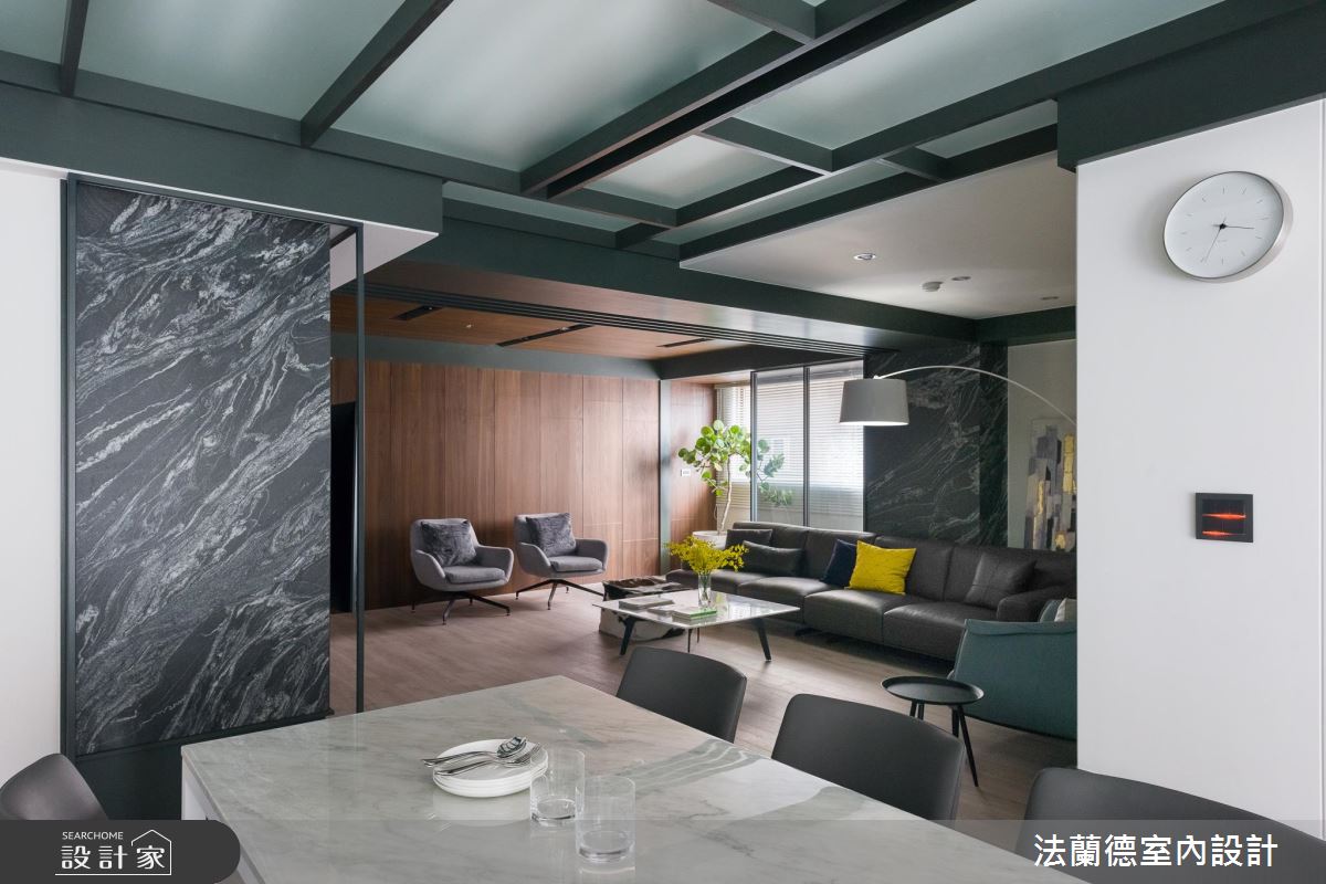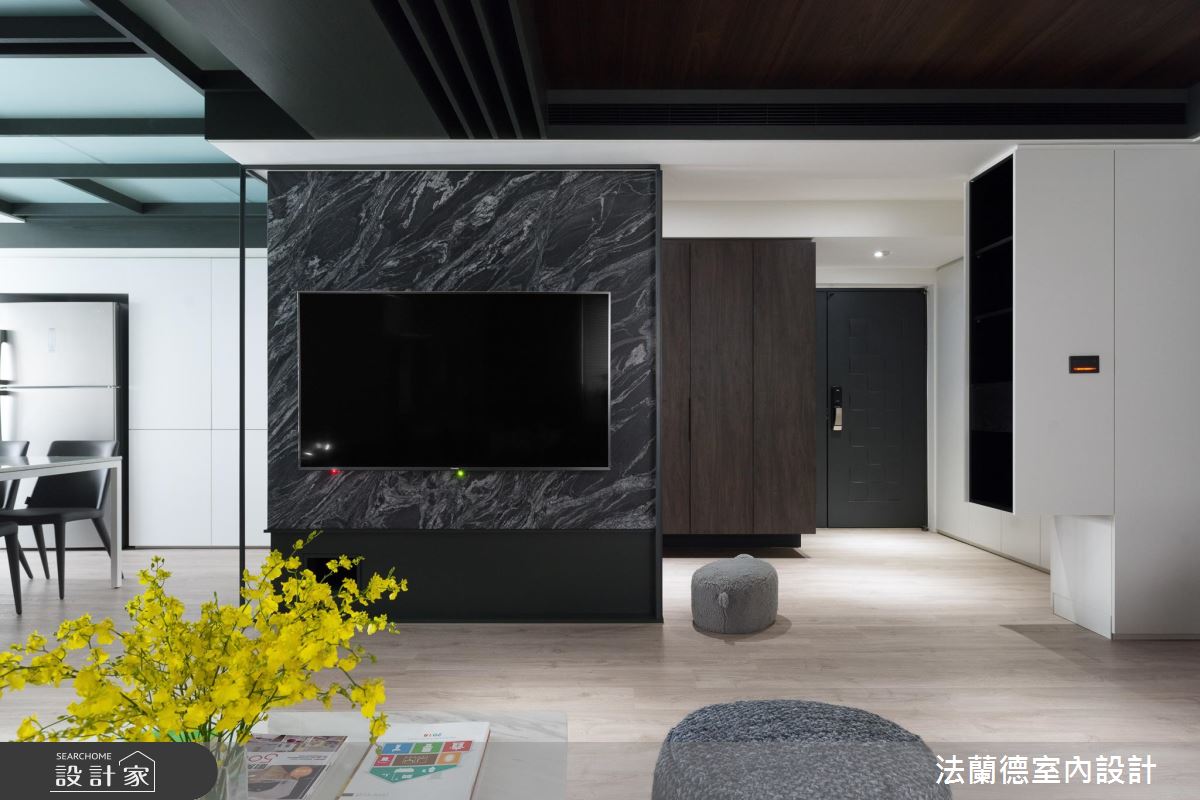 玄關藉由向外凸出的黑白展示櫃,界定格局的範圍,再加上木紋收納櫃,共同形成豐富的空間機能。客廳利用溫潤的木質,從牆面一路延伸至天花,搭配石紋裝飾的大型柱體,讓一家人能沉浸玻璃拉門透進的充足日光,感受空間散發的自然氣息。電視牆則選擇鐵框結合石材,創造沉穩的視覺效果。