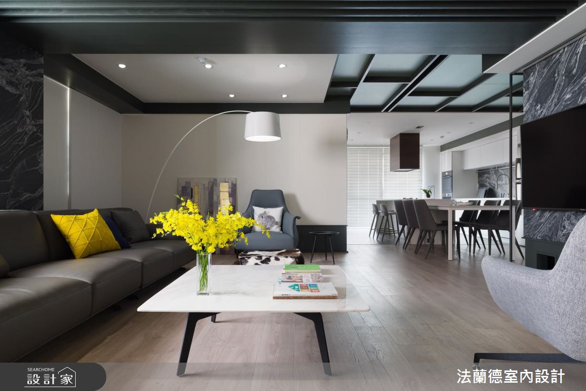 設計師塗黑橫貫客廳的大樑,且運用平行線條去化解樑柱的突兀,讓空間保持敞亮的氛圍,全家人能夠自在地互動交談。