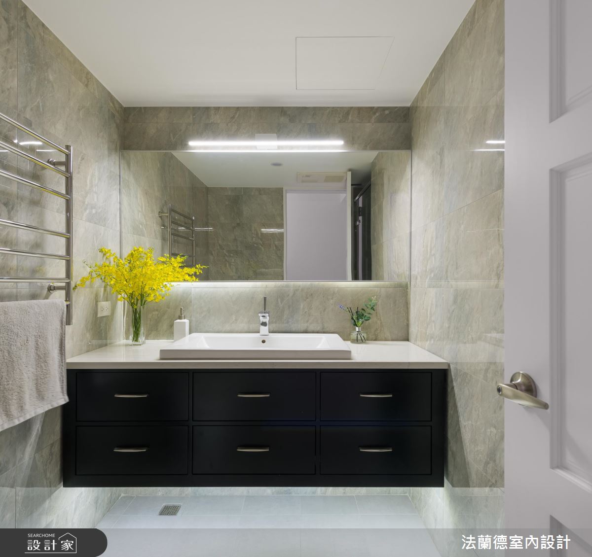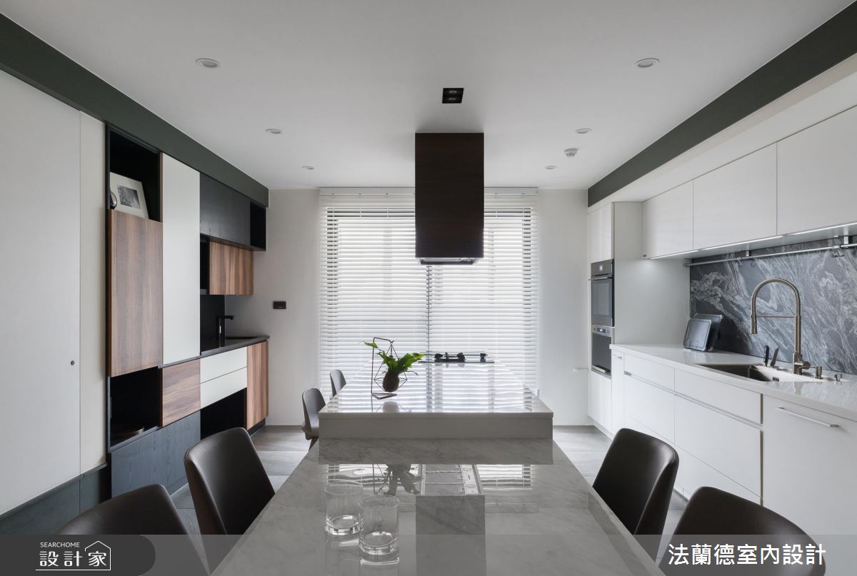 廚房則變更為開放式設計,將餐廳和廚房整併於一處,讓餐廚機能更加完整,光線也能夠深入室內,並採取格狀天花,延伸空間的高度,營造不同的格局氛圍。餐廚區塊一面選用純白的歐式廚具,配合石紋飾牆,另一面則利用不同色彩的門片,切割出富有層次的櫃體造型,象徵家人性格雖有不同,但缺一不可。