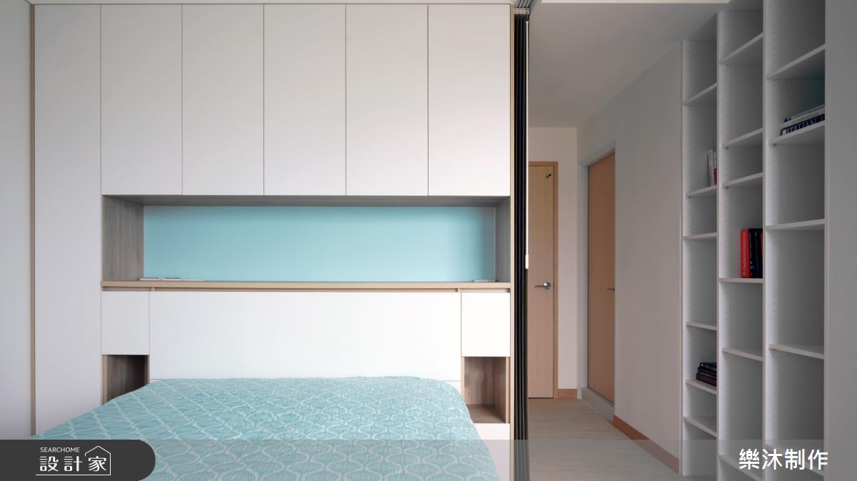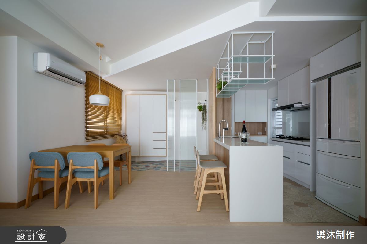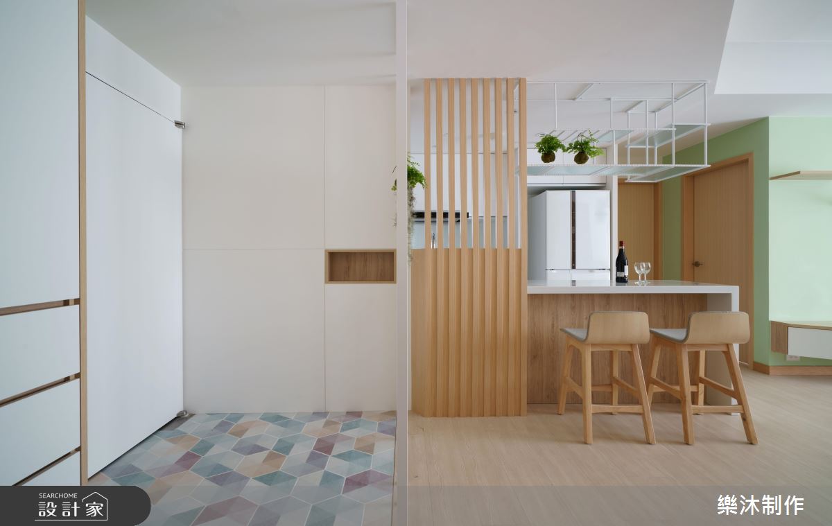 玄關處,白色鐵件玻璃屏風,為室內增加隱私屏蔽,並以不飽和的六角形地磚迎接1 家 3 口,輕鬆又帶點趣味,為整室風格下了完美註解。餐廚空間,以流理中島檯,作為廚房與餐廳的過渡區,三種機能平行鋪排,便於烹煮、用餐動線。而延伸的中島流理檯,同時作為酒吧、輕食、下午茶機能,懸吊式白色鐵件的應用,輕盈了頭頂上方的櫃體壓力,加注幾許清新感。客廳與餐廚空間零阻礙,透過電視牆的一抹嫩芽綠,延攬日光與自然氣息入內;電視區不落地的影音收納櫃,輕巧又便利,靠窗處的垂直層架,提供屋主收藏品展示舞台,若未來有飼養寵物,也能成為娛樂跳台;沙發背牆透過斜切門片,讓部分收納展示呈現,豐富系統櫃表情。