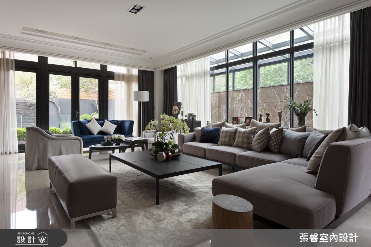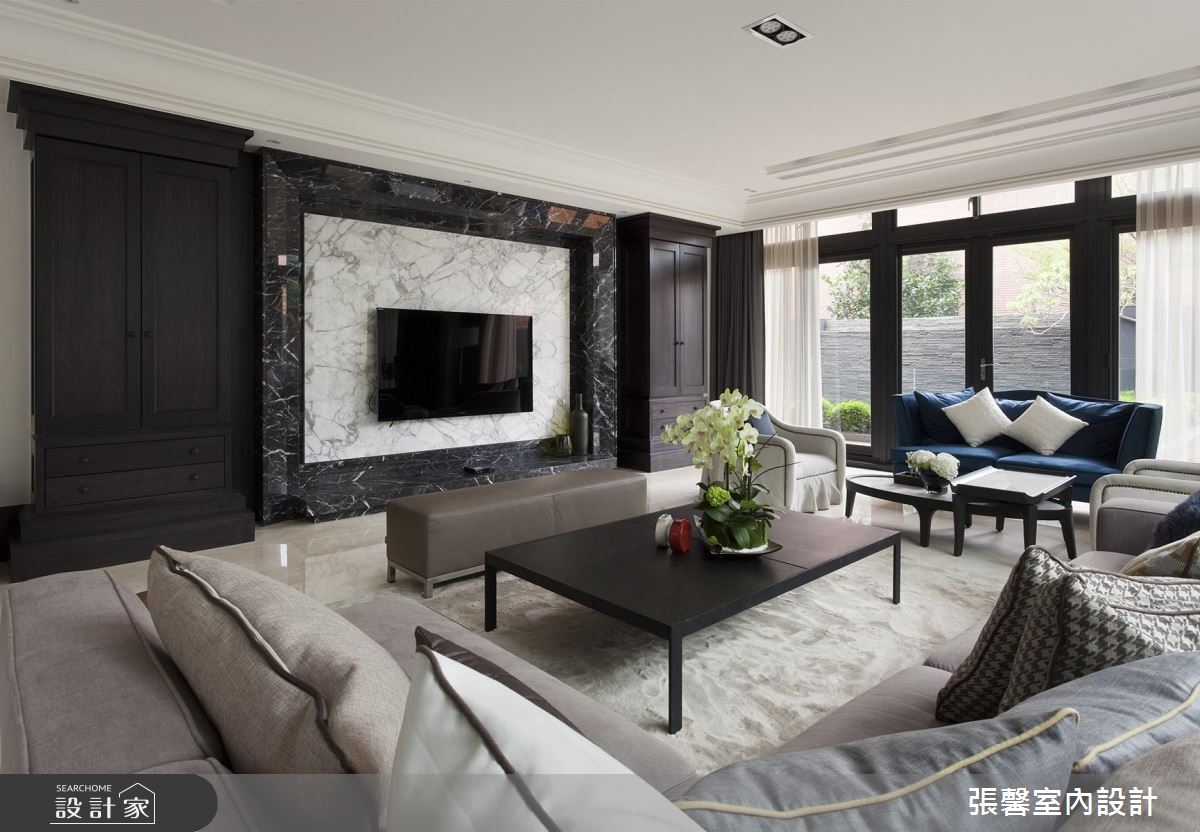 由於戶外有豐富的庭園造景,因此公領域以大面積的落地窗,將美好的景緻與充足的日光帶入室內,讓人感受滿滿的清新氛圍。一樓以輕食吧檯區為核心,左右各自通往客廳和餐廳區域。客廳電視牆透過黑白石材肌理,表現立面的視覺層次,而兩側深色木紋收納櫃則以對稱的形式設置,讓整體空間看起來大氣穩重。