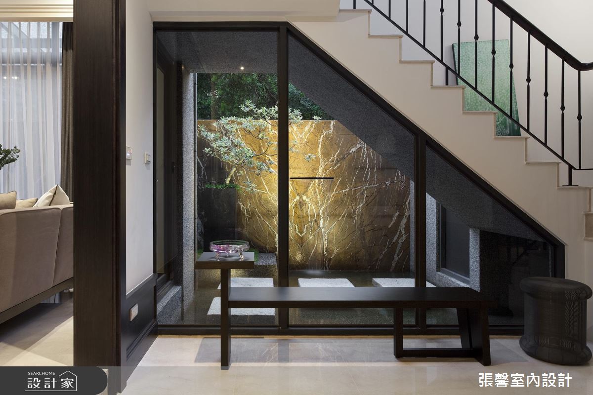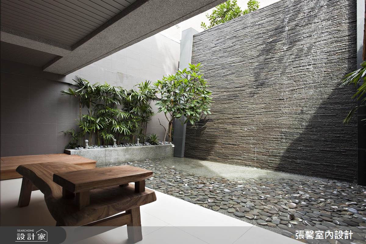 戶外運用瀑布意象,塑造帶有禪味的自然景色,讓屋主能坐在木椅上一邊聆聽水流,一邊沉澱情緒。
