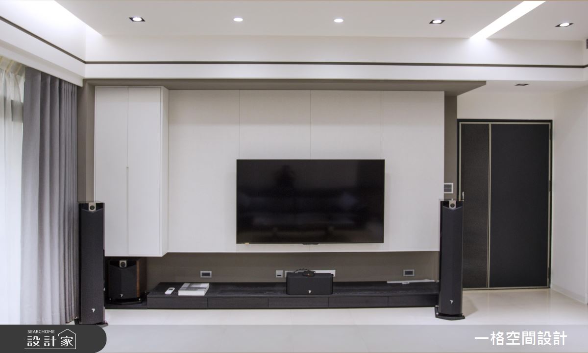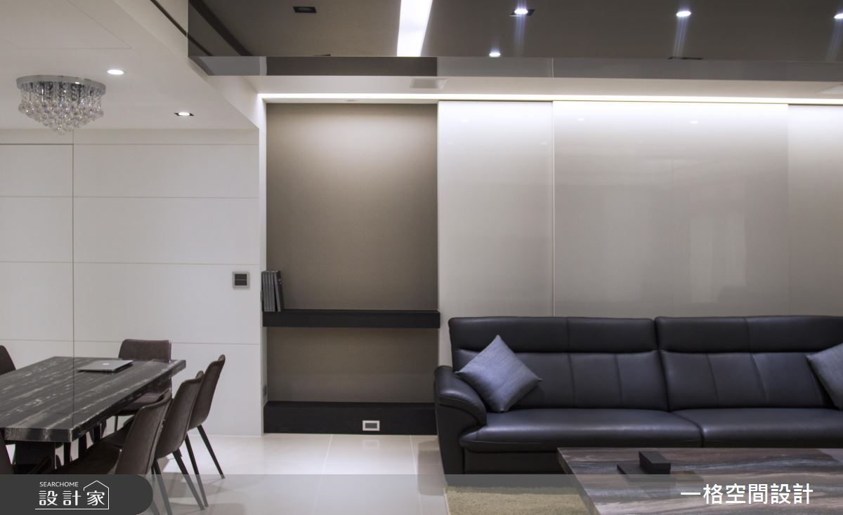 沙發背牆利用白色鋼琴烤漆門片,隱藏一整牆的收納空間,明亮的設計降低櫃體給人的壓迫感;一旁刻意保留展示牆面,讓此區域成為入門第一眼看見的端景。立面的橫紋設計,自玄關一路延伸至餐廳,把通往居家各處的門扉串聯在一起,同時也融入收納於其中,塑造完整的室內機能。
