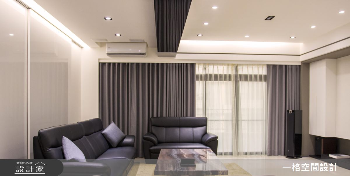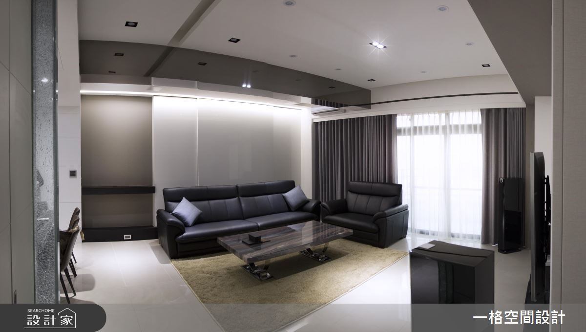原屋況最大的問題在於拆除隔間後,留下天花橫樑的突兀感,而設計師巧妙運用鍍鈦板三面飾樑,將原本令人不悅的缺點改造成空間的亮點,延伸了公領域的視覺效果。客廳天花透過兩道間接照明,與橫樑形成垂直角度,定義光亮的區塊範圍,而牆面上方的深色線條,也勾勒出空間的立體度。