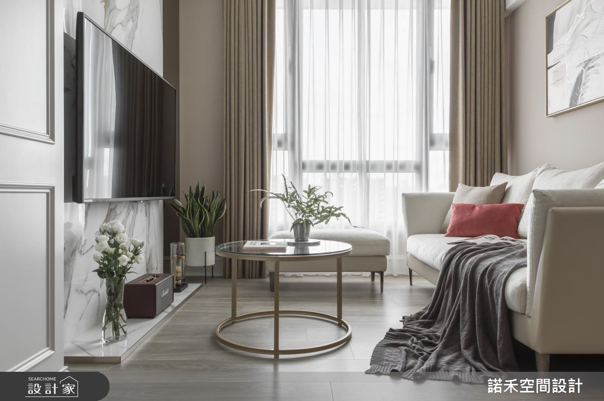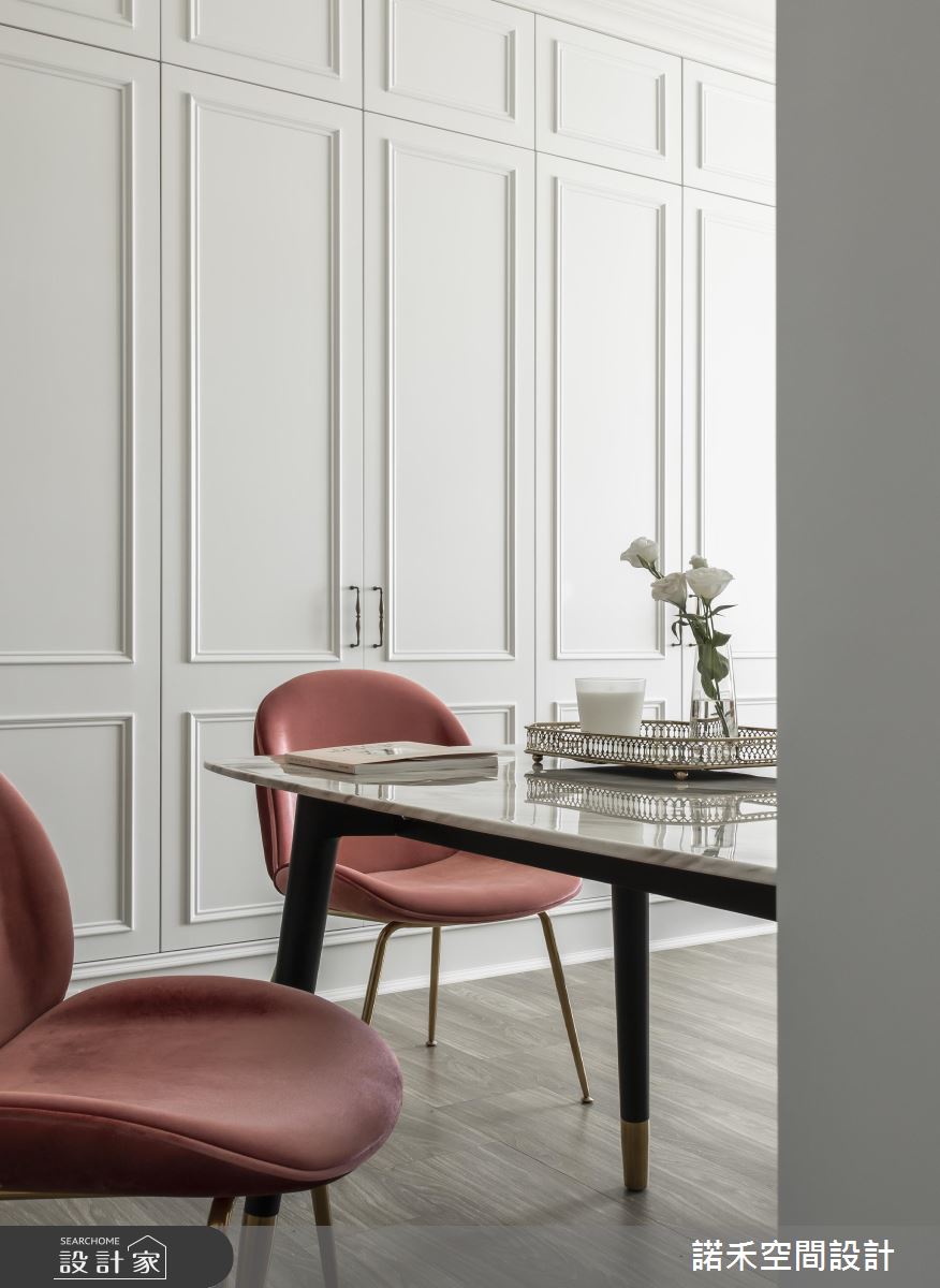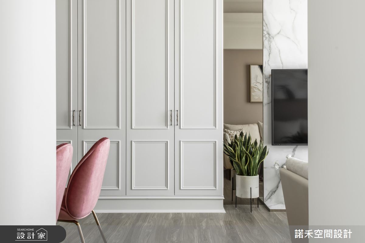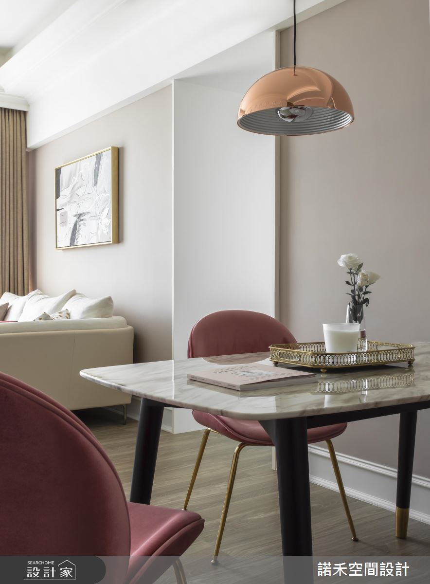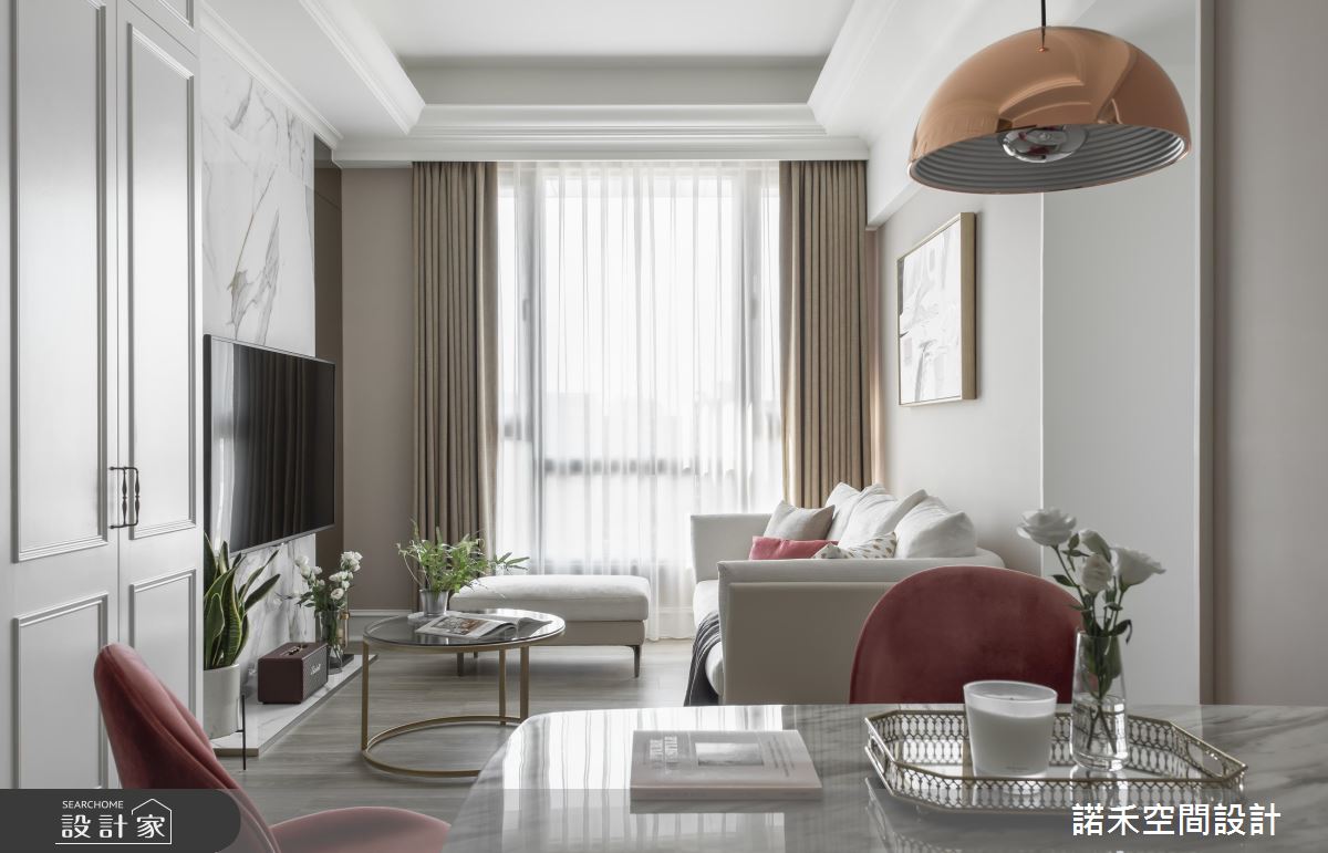 公共空間格局開放,透過挑高手法抬升視覺,落地窗與落地簾幕的輔助,無限拉開小宅視野尺度;色調上以柔白杏色作為主導,為生活染上溫柔紓壓氛圍,再以粉嫩色餐椅、抱枕及金屬燈具點墜式裝飾,時尚優雅恰如其分;白系大理石紋理電視牆,加注白色空間的浪漫想像,兩側鏡面對稱手法,彰顯大方氣勢,與落地窗相映成趣:而簡約線版設計的純白大收納櫃置於空間中,也不顯壓迫。