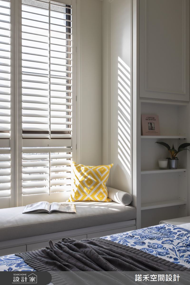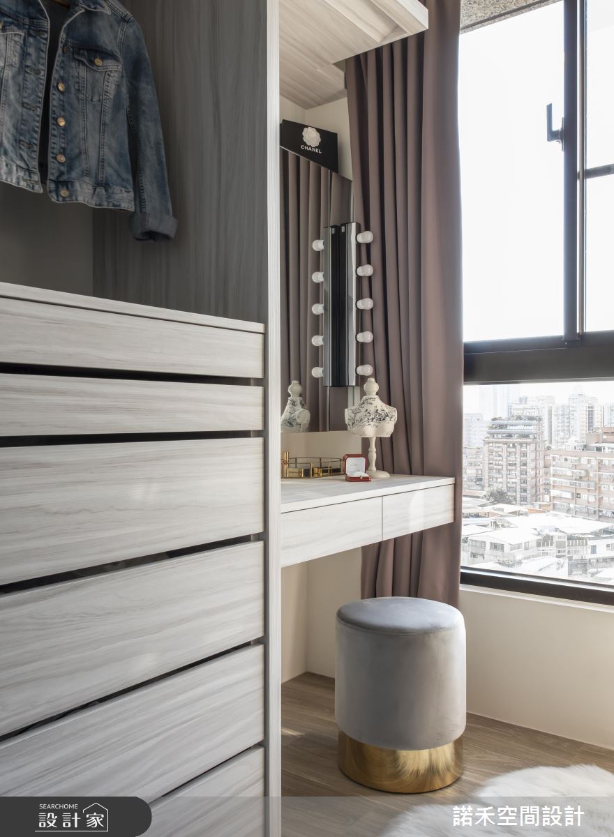 主臥善用窗邊好採光角落,安排臥榻區及梳妝機能;衣櫃收納部分展示規劃,減輕櫃體占滿視線的壓力。