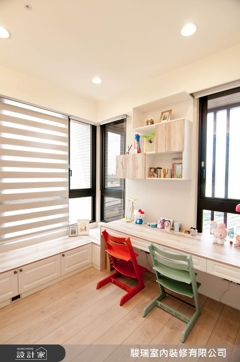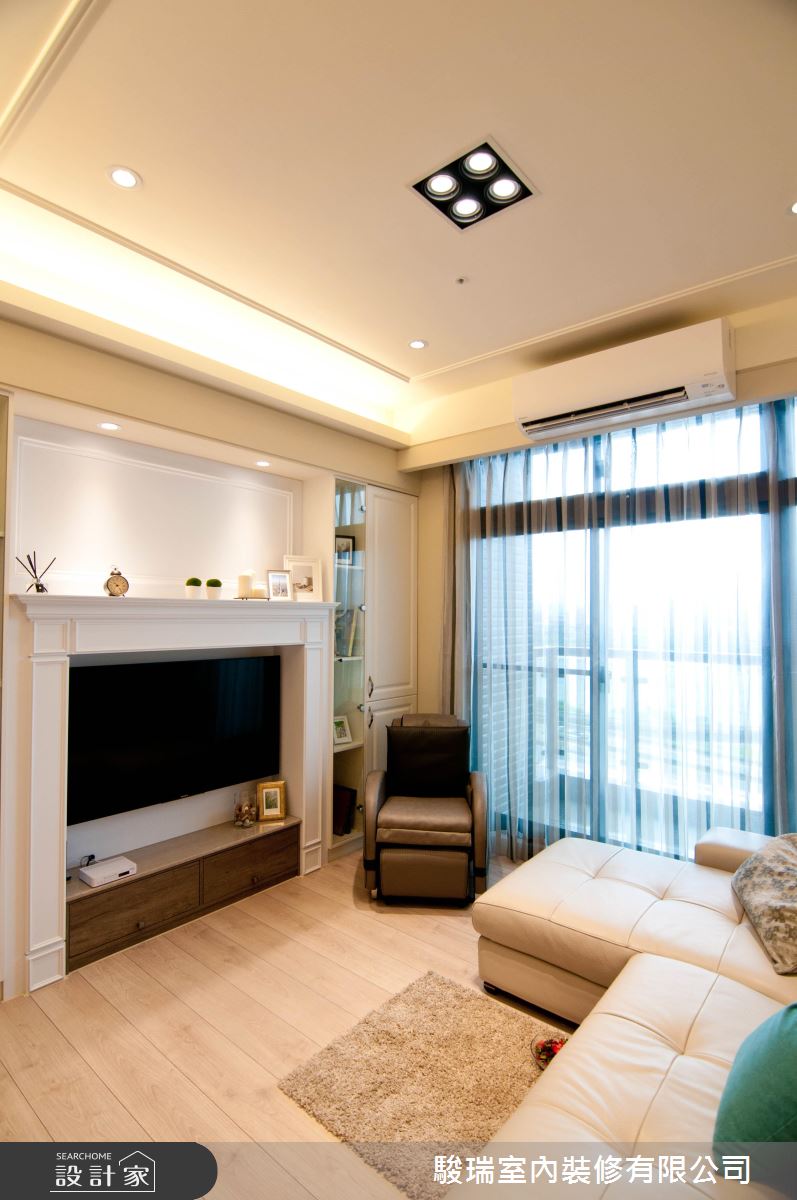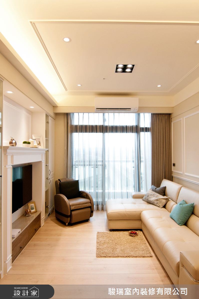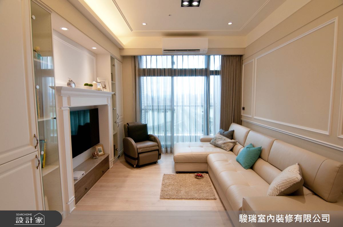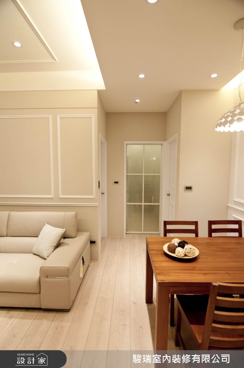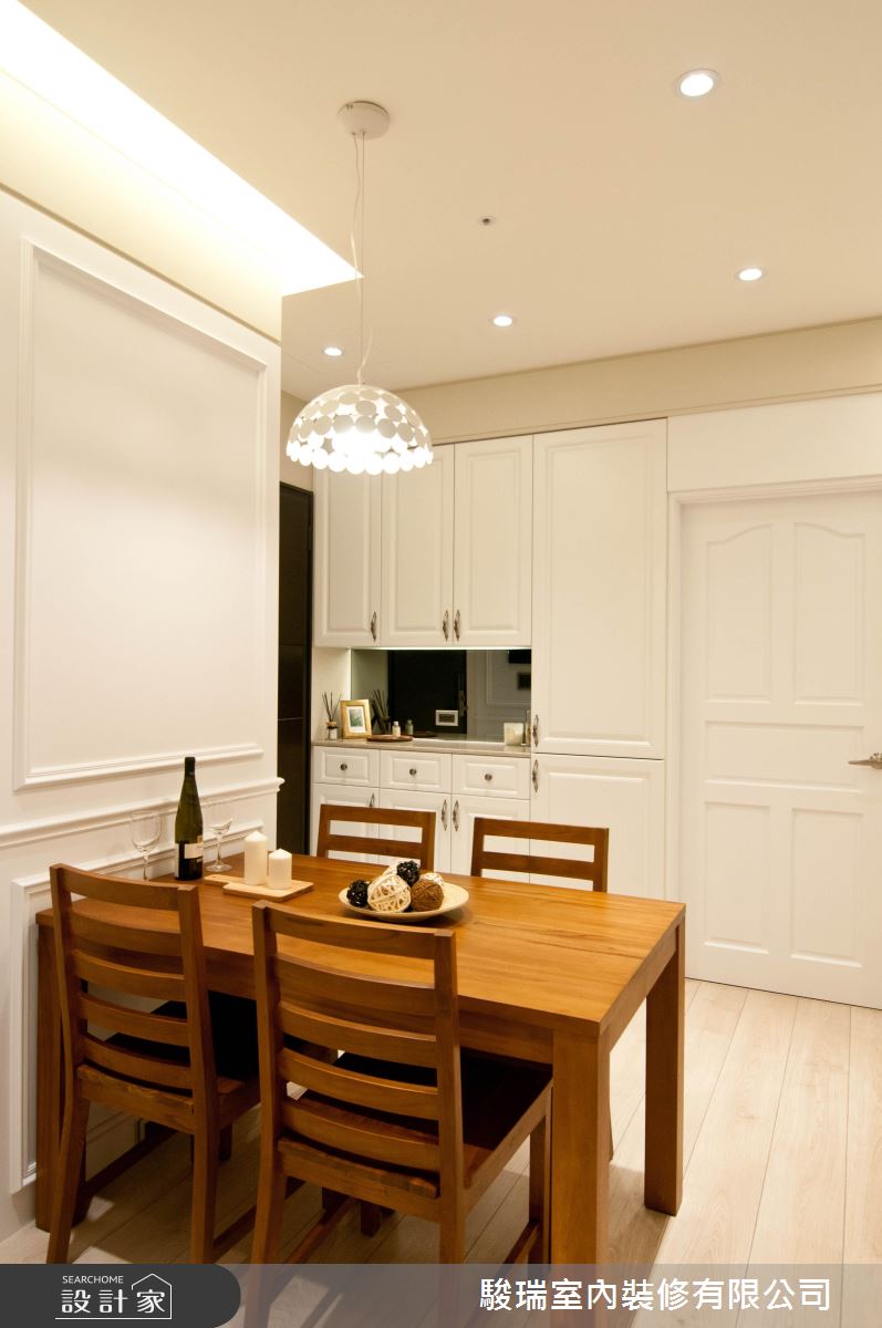 玄關區,透過花磚地坪,劃出開放格局的隱形的獨立範圍,賦予迎賓入口趣味視覺!室內樑柱過多,透過線板設計隱匿天花樑線,化解原屋況缺陷,並打開格局,無限拓展公領域空間。客廳電視牆為屋主客製化壁爐造型,創意巧思聚焦視覺,呼應美式風情主軸;兩側對稱垂直櫃體安排,與垂降落地簾幕,製造客廳大方氣勢;收納部分展示規劃,減去櫃體沉重視覺,為收藏品創造展示舞台。用餐區,餐桌特意依據牆面線板寬度鋪排、門片隱形於牆面的手法,讓空間俐落整齊、連貫舒暢。