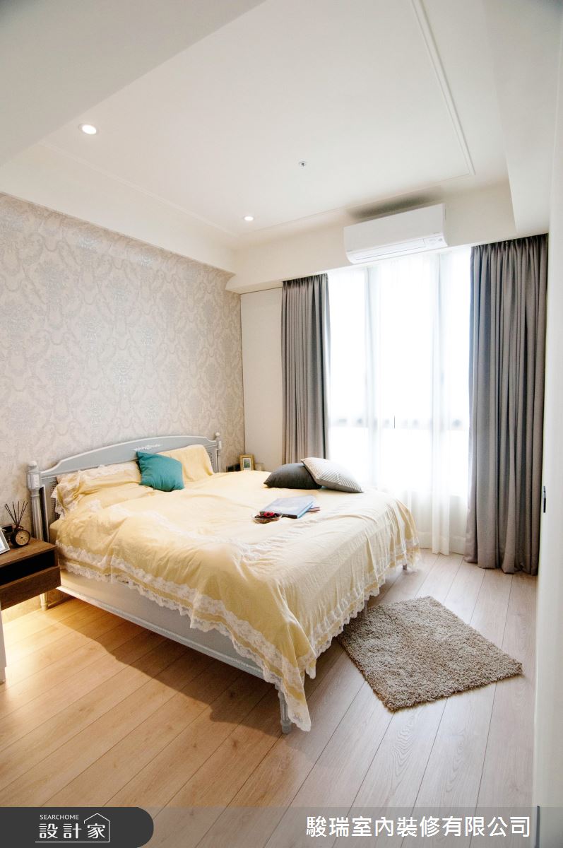 臥房床頭牆選擇古典壁紙,佐浪漫鵝黃寢具,彰顯優雅、浪漫的私領域風格,延續公共空間的落地窗設計,納入充沛自然光。