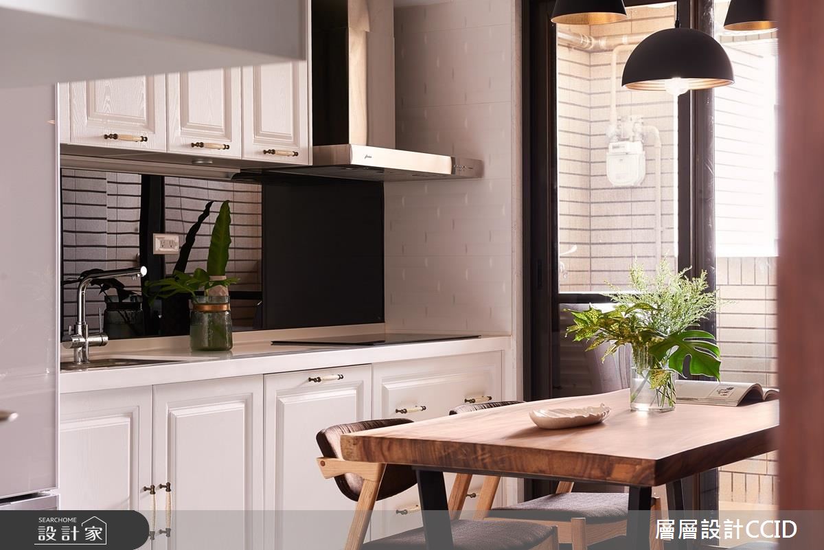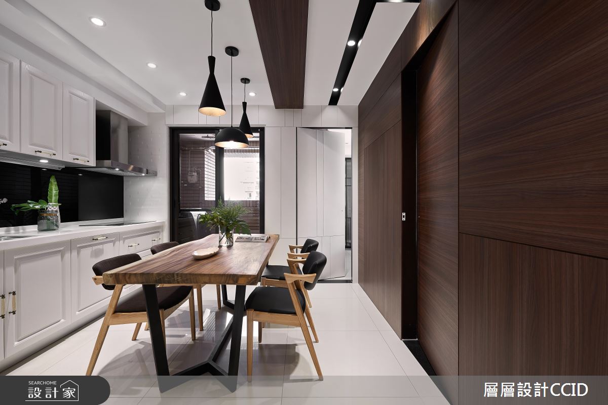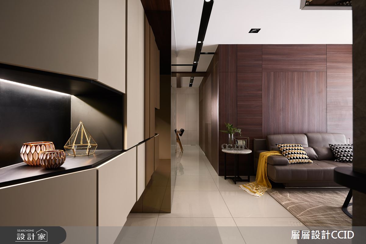 玄關區,45 度轉角斜切櫃體工法,拉開迎賓入口的寬度,特殊角度為鏤空收納增添視覺趣味,底部不做滿則讓量體輕盈呈現。客、餐廳開放卻各自獨立,以木質與白色貫穿,拿捏色彩比例及異建材應用,凸顯既融合又別具特色的空間感。客廳電視牆,運用高雅灰大理石紋理,跳脫上櫃與下櫃的單純色調,電視旁刻意錯落的層架設計,簡練卻堆疊出豐富層次;玄關櫃後方為公領域收納空間,相同的寬度疏理整齊的廊道動線,金屬鏡面材質,兼具放大、鏡面機能,跳脫一片木與白色系,點綴居家時尚奢華氣質。餐廚區,一字型廚房與長餐桌並行,動線順暢,純白收納櫃門片以簡約線版帶出輕美式鄉村氣息。
