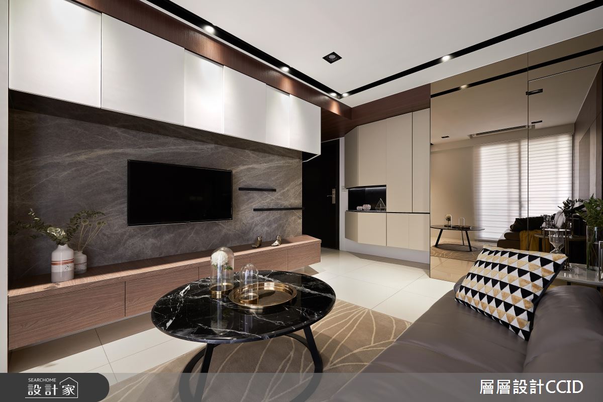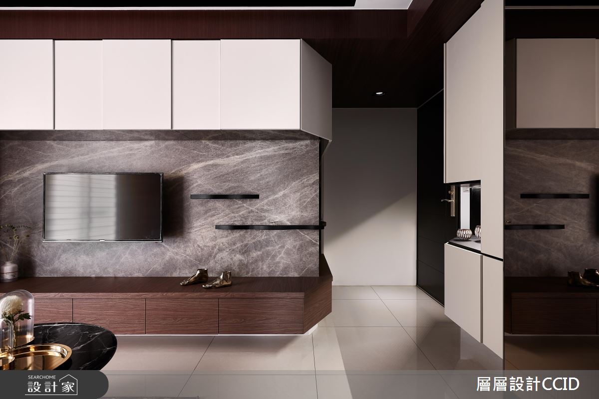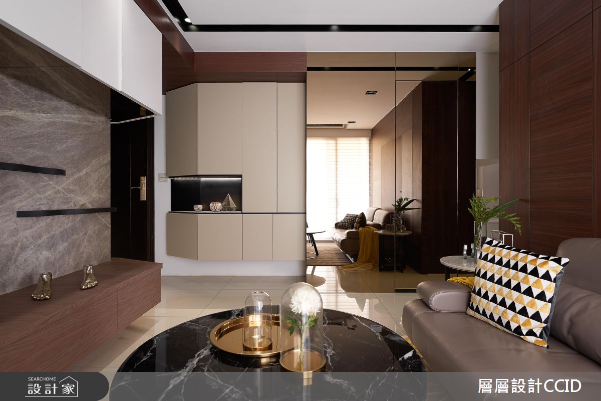 40 坪現代風,井然有序的空間,公、私領域配置得宜,透過木質鋪敘整室的沉穩內斂,更發揮石材紋理、鏡面的通透,展現富含人文韻味的小豪宅風範。