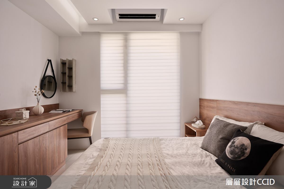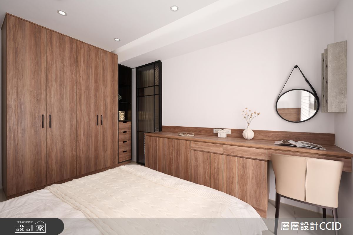主臥選材上,用淺色調木質混搭柔白色系,傾注溫柔舒眠氣氛,而櫃體收納與書桌整合,再透過黑鐵玻璃隔門與黑眶鏡面,點綴個性化生活空間,讓化繁為簡的陳設美學一氣呵成。
