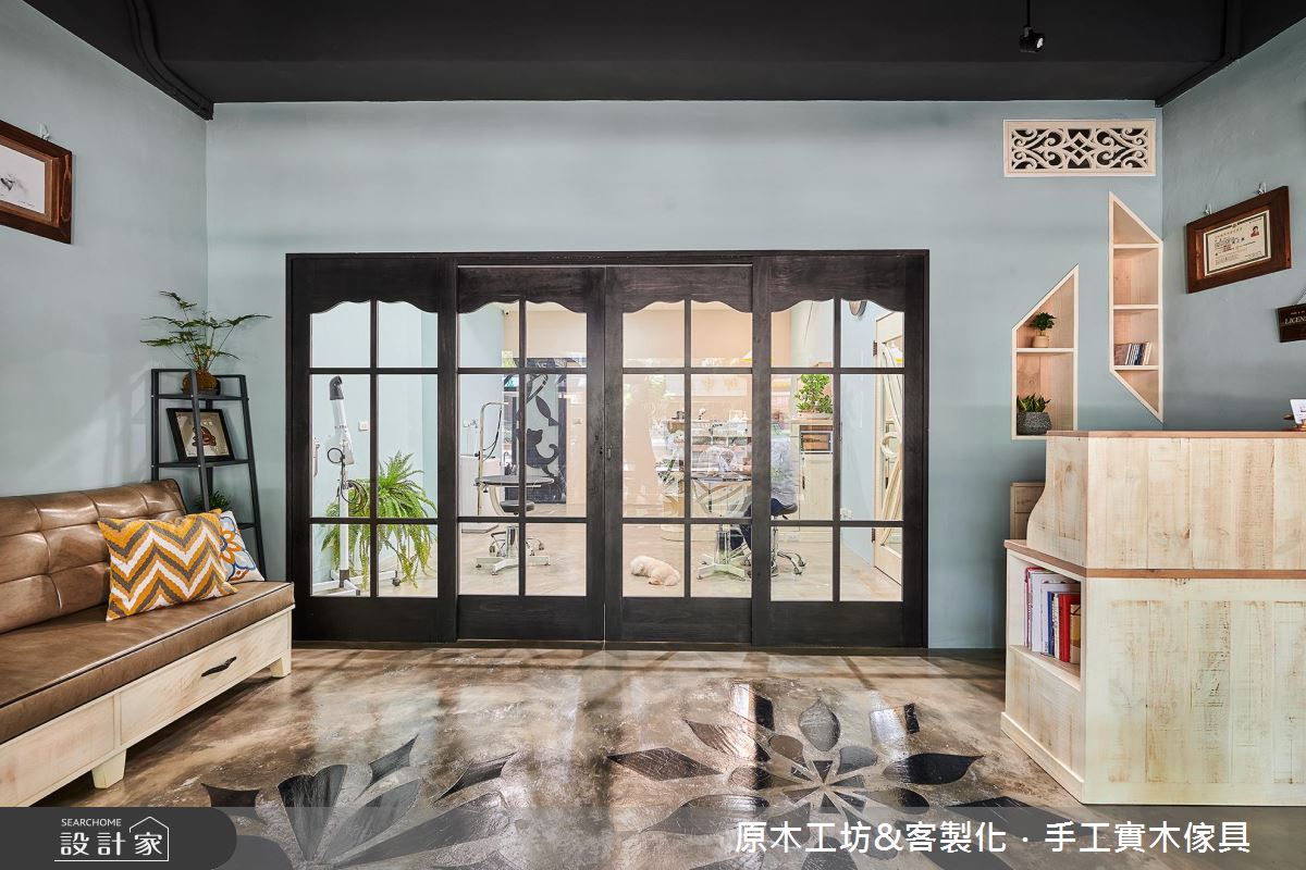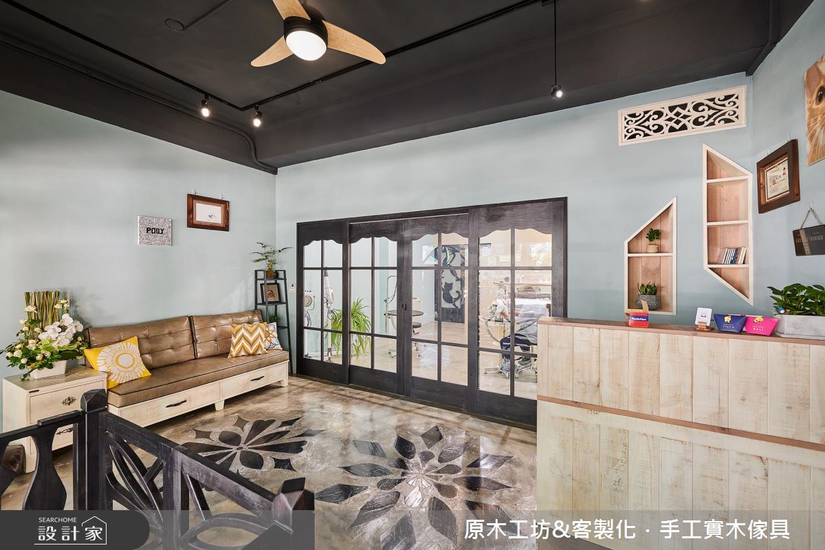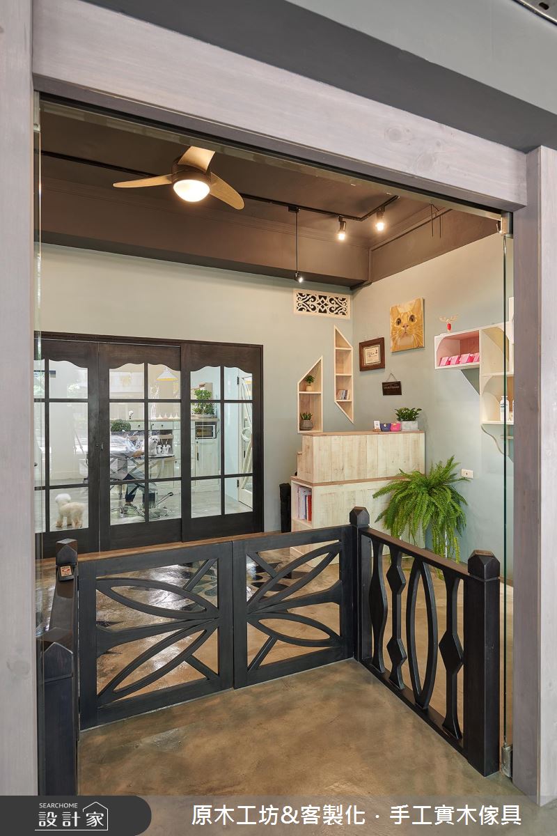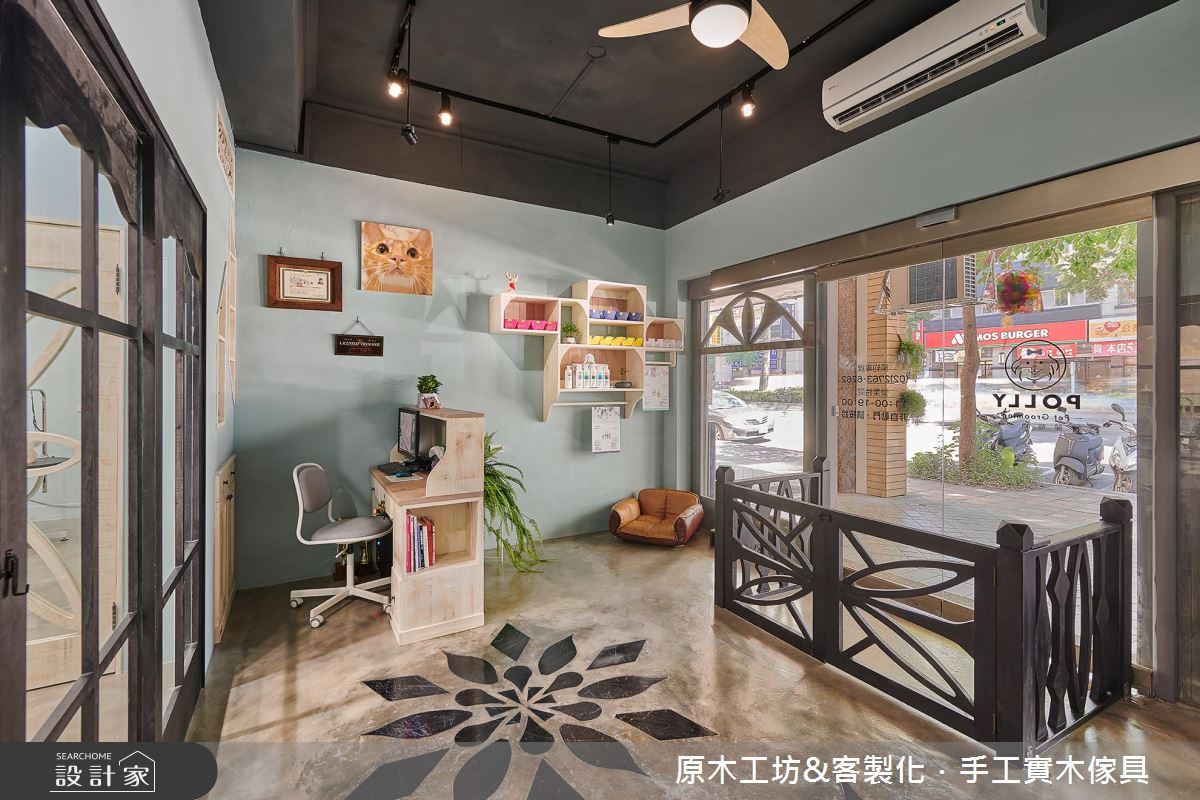 大門口以漆上黑色的木作安全門圍塑,有效防止毛小孩跑到戶外,兩側玻璃櫥窗搭佐對稱的門拱原木造型,呼應鄉村風元素,玻璃質感的隔間手法,讓戶外的光線能夠延伸入室,更顯潔淨明亮之感;天花板漆上黑色後更顯挑高,軌道燈懸掛其中挹注些許個性色彩;由於寵物美容過程中會有毛髮掉落等清潔問題,選擇地坪以水泥飾底,入口處更嵌入花朵造型的原木材質,與復古的皮革沙發、牆面的鏤空雕花風口、風格畫作,感染一片優雅的氣息;角落擺設一座木作櫃台,後側壁面嵌入幾何造型的層板,另一側則懸掛展示櫃,陳列出寵物相關的產品,繽紛的色彩運用以及不規則的櫃體陳列,交織出活潑的空間氣息。