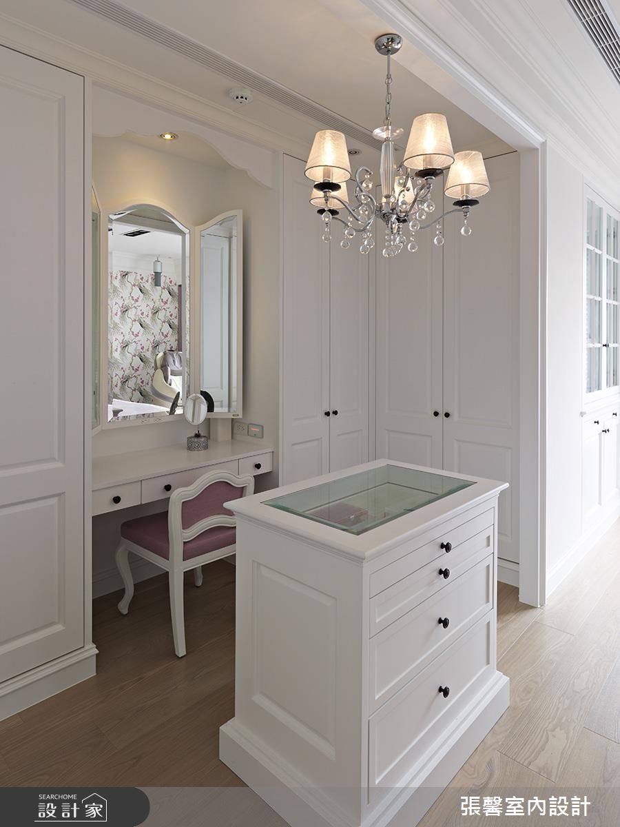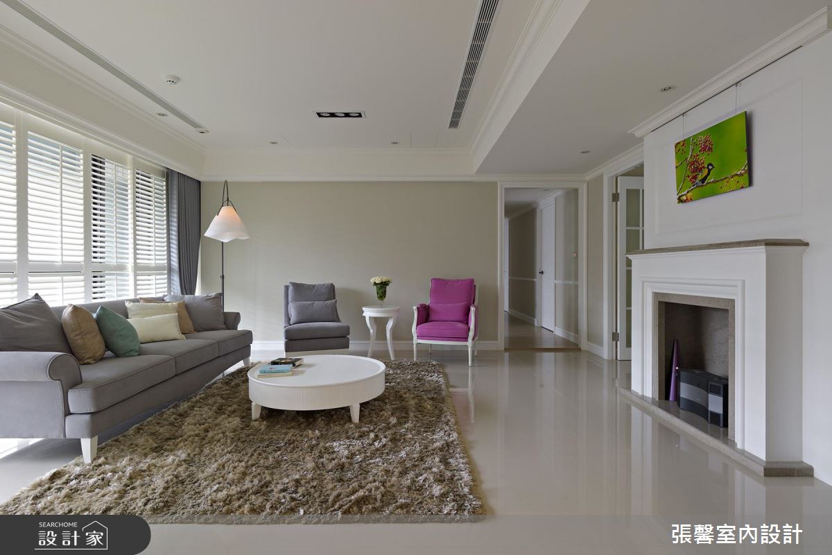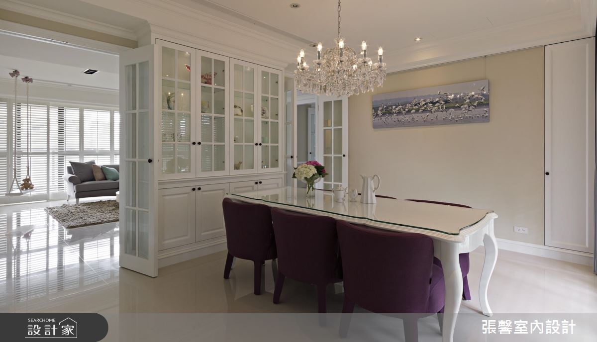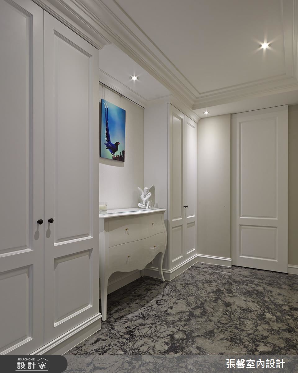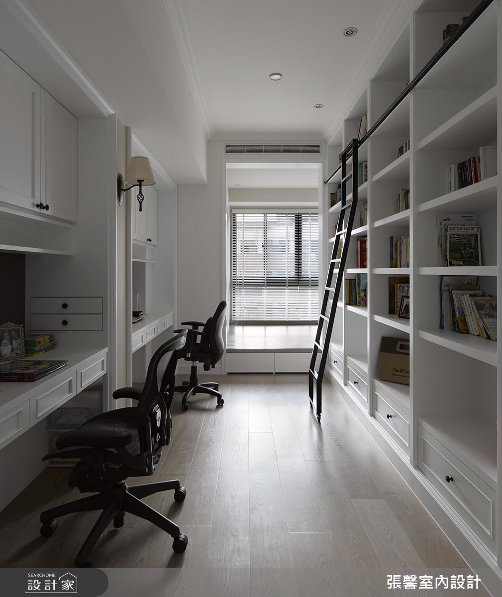 客廳區,以乾淨敞亮的大地色、純白色油漆鋪敘柔和氣息;設計師發揮巧思在角落安排盪鞦韆,將客廳變身小孩的大娛樂室,也為寬敞的公共空間打造另類的吸睛佈置;壁面懸掛屋主父親的攝影作品,將自然景致帶入空間;考量電視非1家3口生活重心,改以壁爐取代電視牆,凝聚一家人情感,並替寬敞淺色系居家,注入暖氛圍意象;餐廚區,壁爐兩側以對稱的白框拉門作為客、餐廳分界,圍塑美式浪漫與古典優雅氣氛,即使雙門關上,透過玻璃穿透特性,光影與視線依舊暢通;餐桌刻意降低高度,保留空間使用彈性,用餐、寫作業、下午茶皆舒適,別出心裁的餐椅選擇,提升用餐區尊榮質感!書房空間,共用的長書桌、整落書櫃平行設計,梳理自然光順暢動線,照亮長型格局。