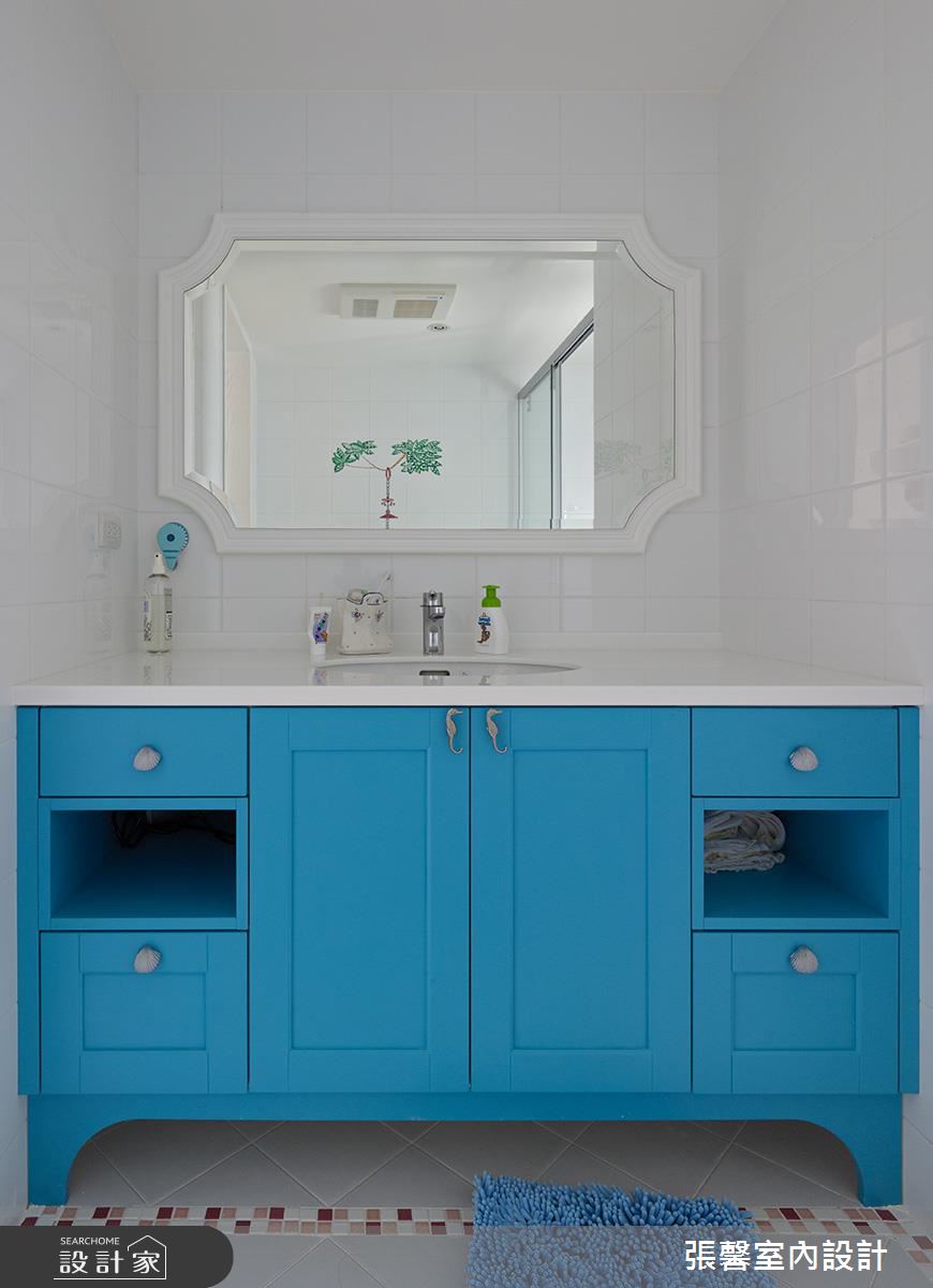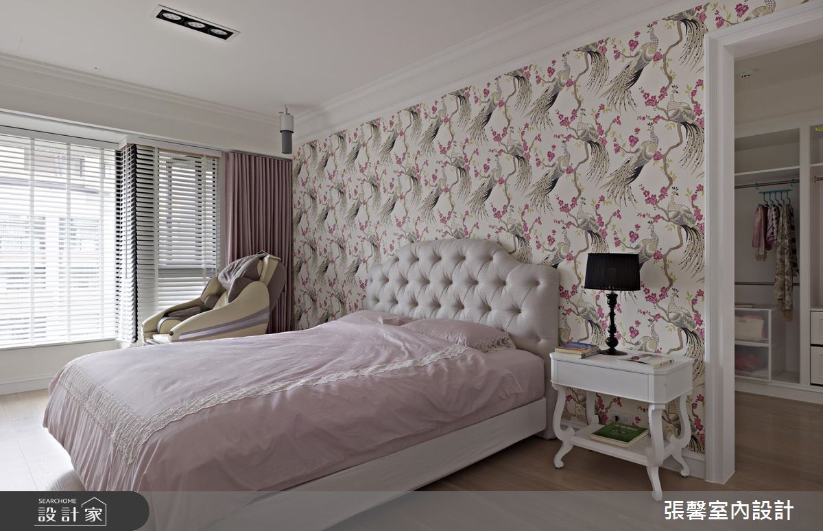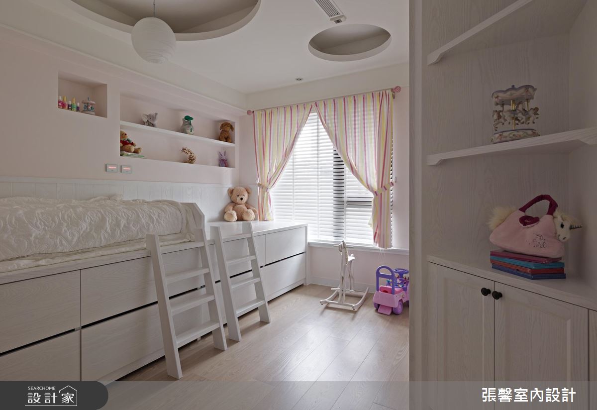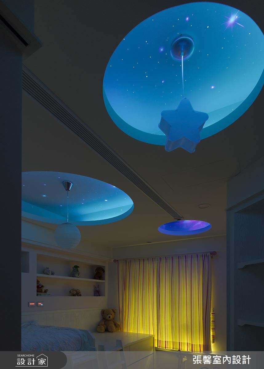 主臥床頭牆壁紙、寢具及簾幕相互呼應,凸顯唯美鄉村氛圍,衛浴則以純白獨立浴缸,鋪敘放鬆浪漫氣息;小孩房發揮設計師天馬行空的創意,透過圓形天花造型、光影輔助,營造宇宙星河想像,落實童話世界主軸。