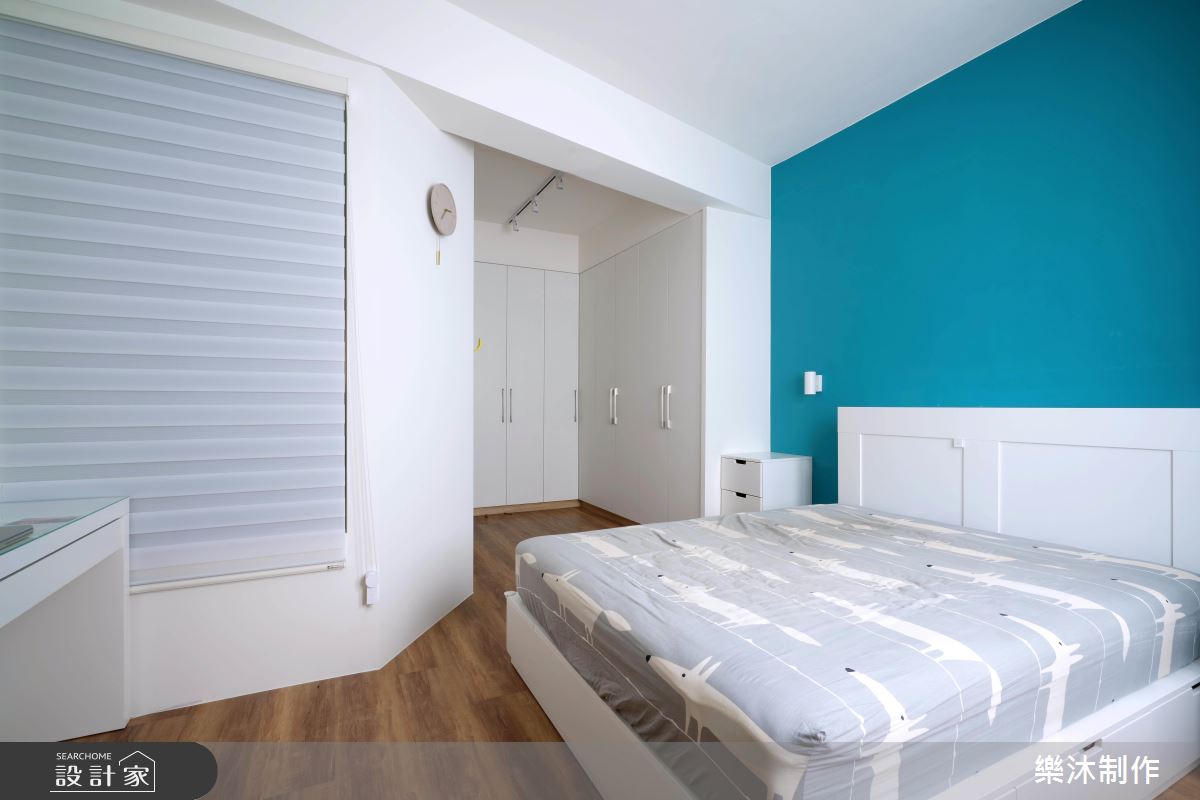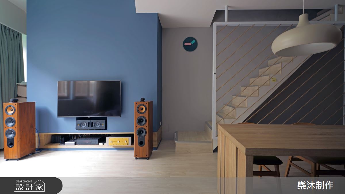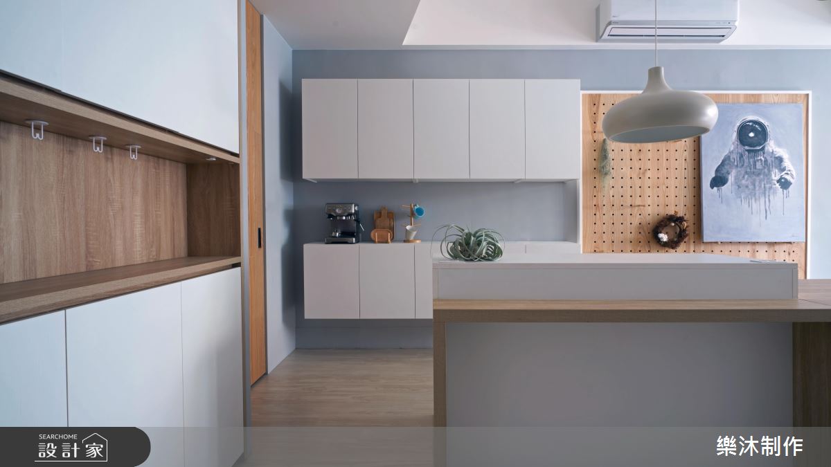 居宅整體以淡雅藍灰色結合溫潤木質、構築溫暖的基底,並擺設一張淺灰藍沙發,與裝飾掛畫、牆面漆色相互呼應,挹注清新的視覺感受;同時藉由線條、量體的妥善配置,讓空間維持寬闊度且兼顧基礎機能,選擇不落地的懸浮櫃體造型,搭配淺白色的面板設計,展現輕盈不厚重的量體感,更刻意在餐廳旁牆面安排大面積洞洞板,兼顧壁掛收納功能,也讓空間裝飾更具彈性,展示出居者的生活美學;臥房則在床頭輔以藍綠色調增添亮點,妝點出居住者的鮮明個性!