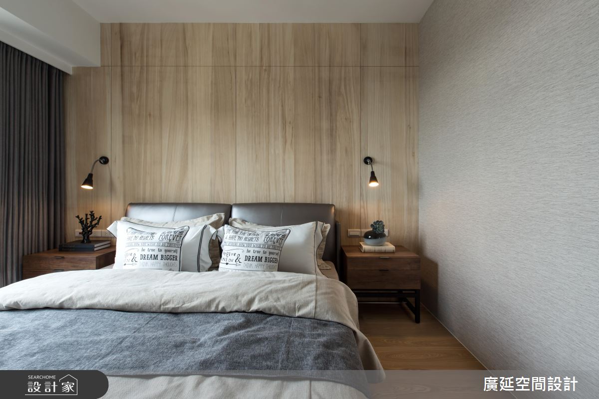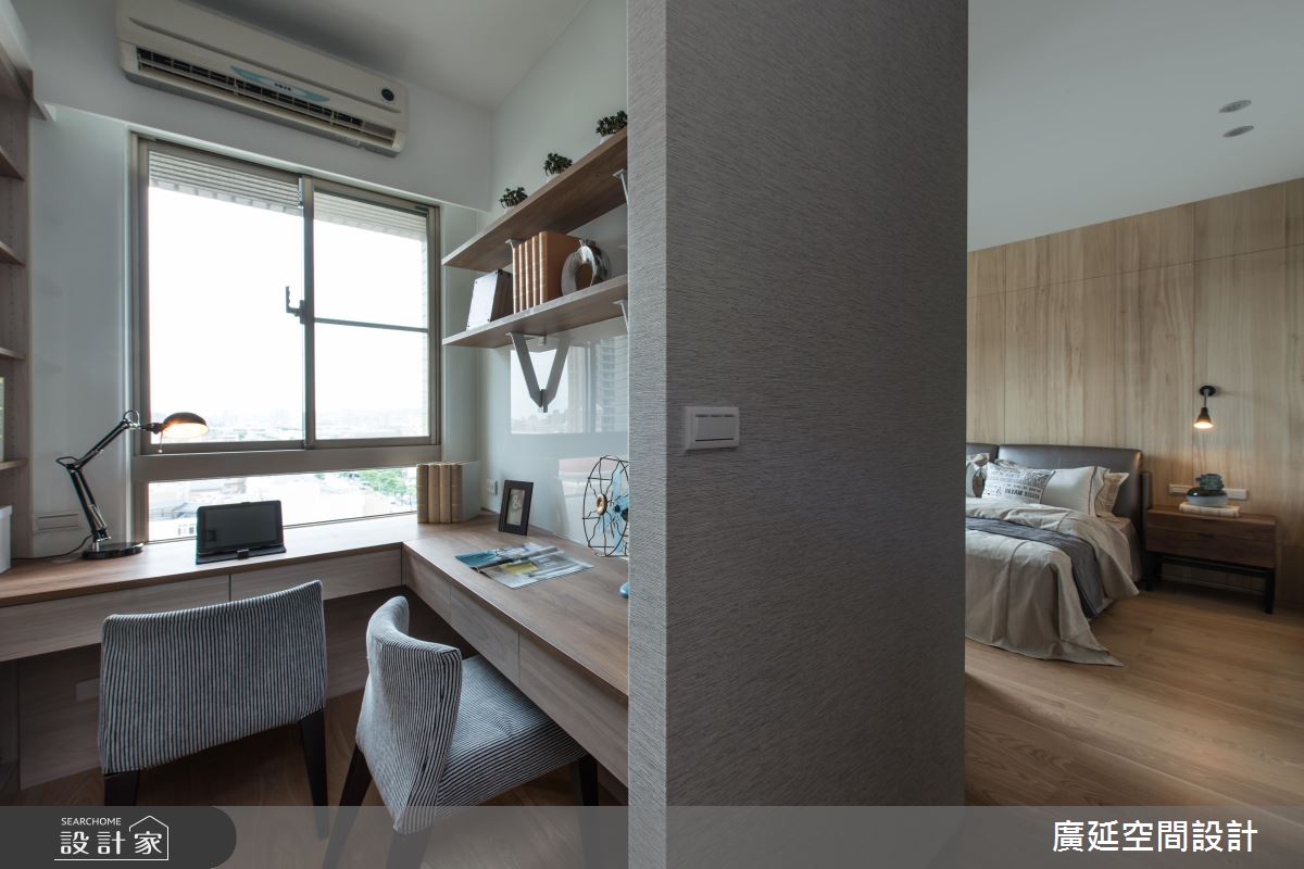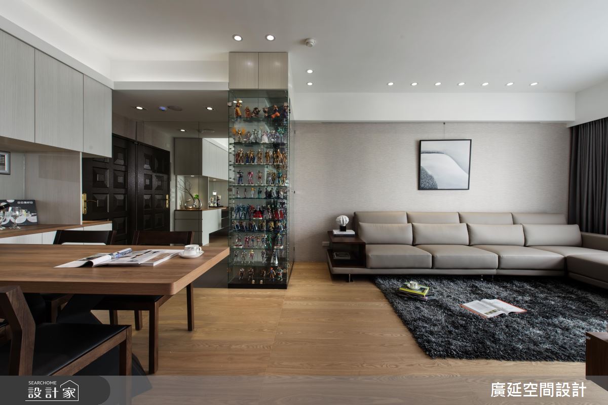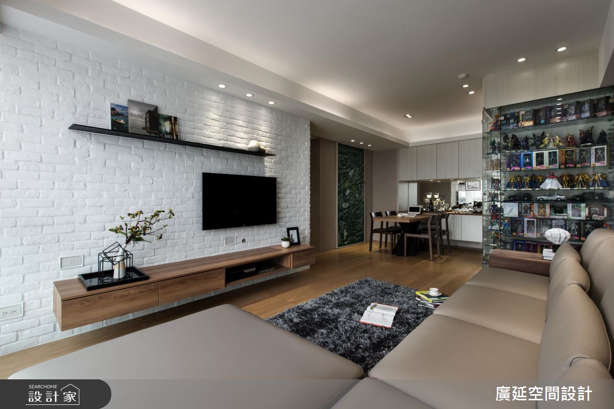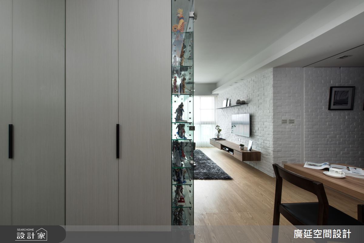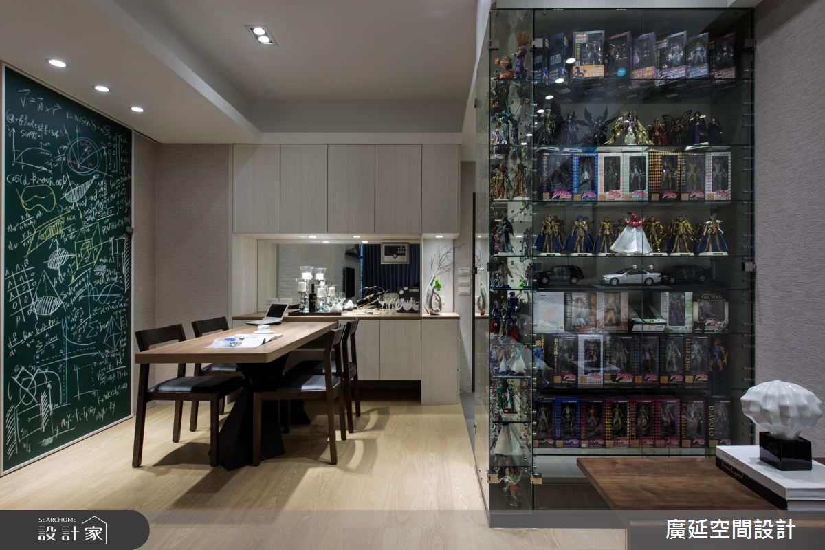 玄關與客廳之間,規劃一座玻璃展示櫃,除了成為收藏公仔的擺放空間之外,也無形中形成玄關與室內的界定,並創造出極佳的聚焦端景;廳區,則在電視主牆以文化石妝點表面,結合上方一道薄片鐵件做為展示平台,底下配置不落地的木作櫃體,展現簡約的主視覺畫面,沙發牆則陳列一幅黑框白底畫作、帶出簡雅的視覺焦點;餐桌特意與餐邊櫃做出一體成形的連結,安排茶水櫃與電器櫃,創造流暢的使用情境,並於旁側牆面打造黑板牆,讓屋主可盡情揮灑天馬行空的創意;寢臥,特意拉大場域尺度、串聯睡眠區與書房的行走動線,並在床頭鋪陳大面積淺色木皮,營造溫馨溫煦的舒適氛圍!