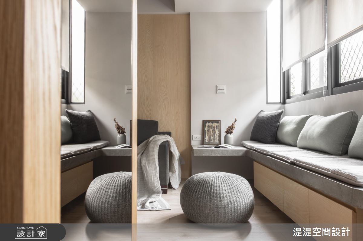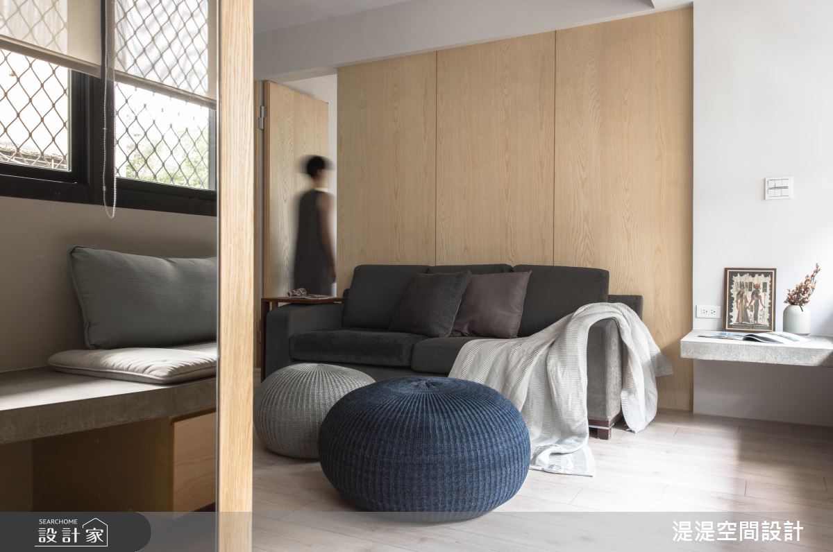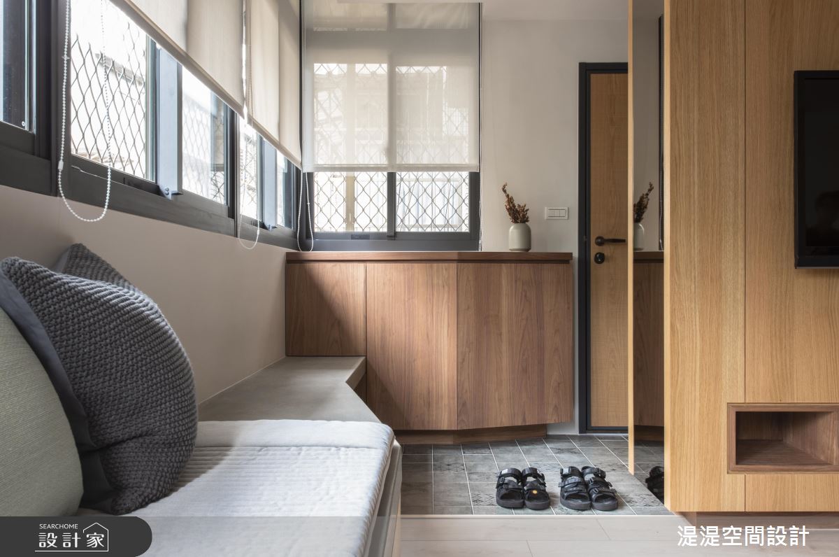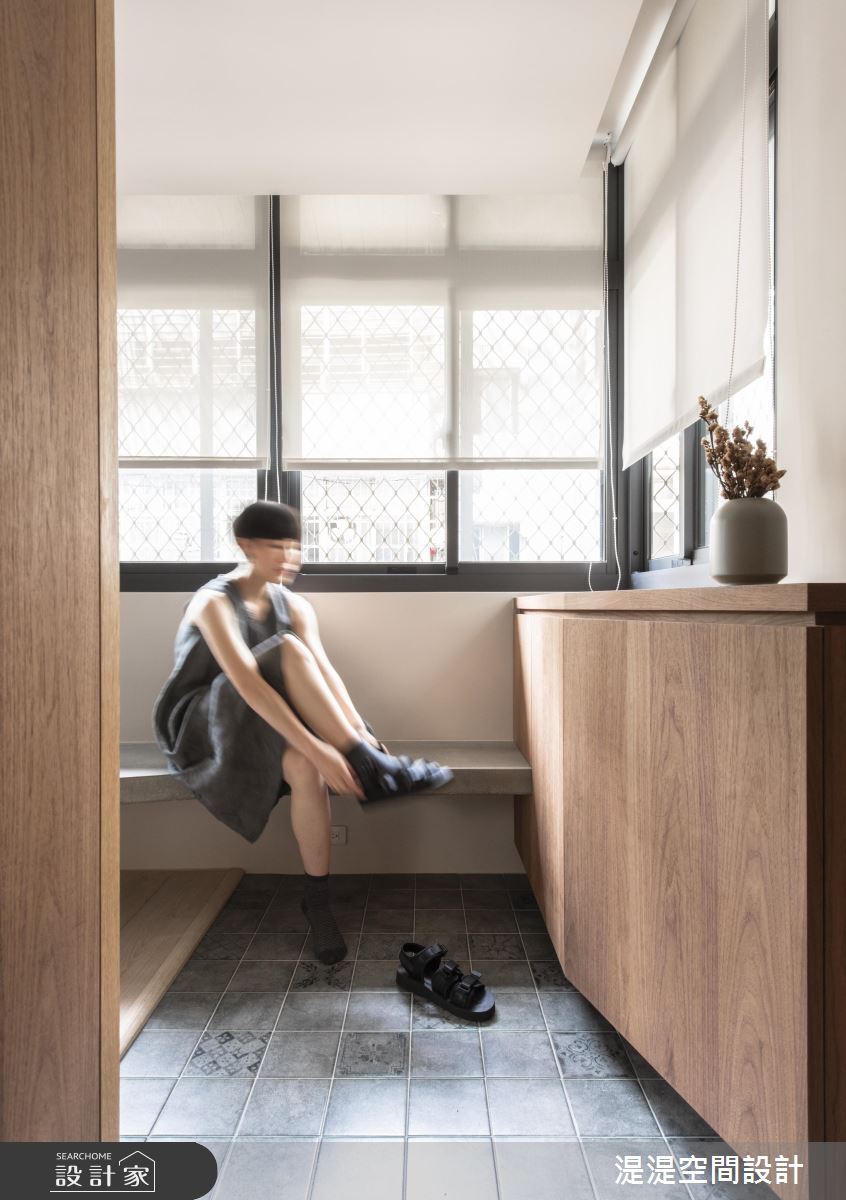 原始屋況中,由大門進入時即見客廳中心,僅以木作隔屏作為緩衝,造型玄關的收納機能不足,形成鞋盒、鞋子雜亂堆放的景況,且原始的沙發與電視的相對位置位於空間長向,使人坐在沙發上觀看電視的距離過遠;於是設計師透過格局改造,在入口處規畫頂天立地的鞋櫃,創造可收納約 60 雙鞋的空間,鞋櫃的背面同時兼做電視牆使用,不僅挹注大容量收納,更形成了玄關的最佳緩衝;轉進客廳,側邊亦安排矮櫃輔助鞋櫃收納,讓鞋子的總收納量可達約 80 雙鞋;而客廳的開窗側下方,更規劃了長達 4 米 5 的水泥臥榻,連接客廳沙發區及玄關,可作為邊桌與穿鞋椅使用,一舉兩得!