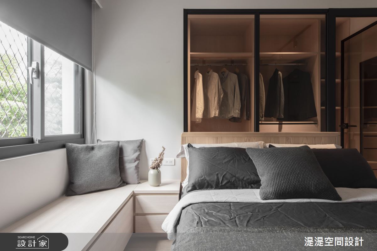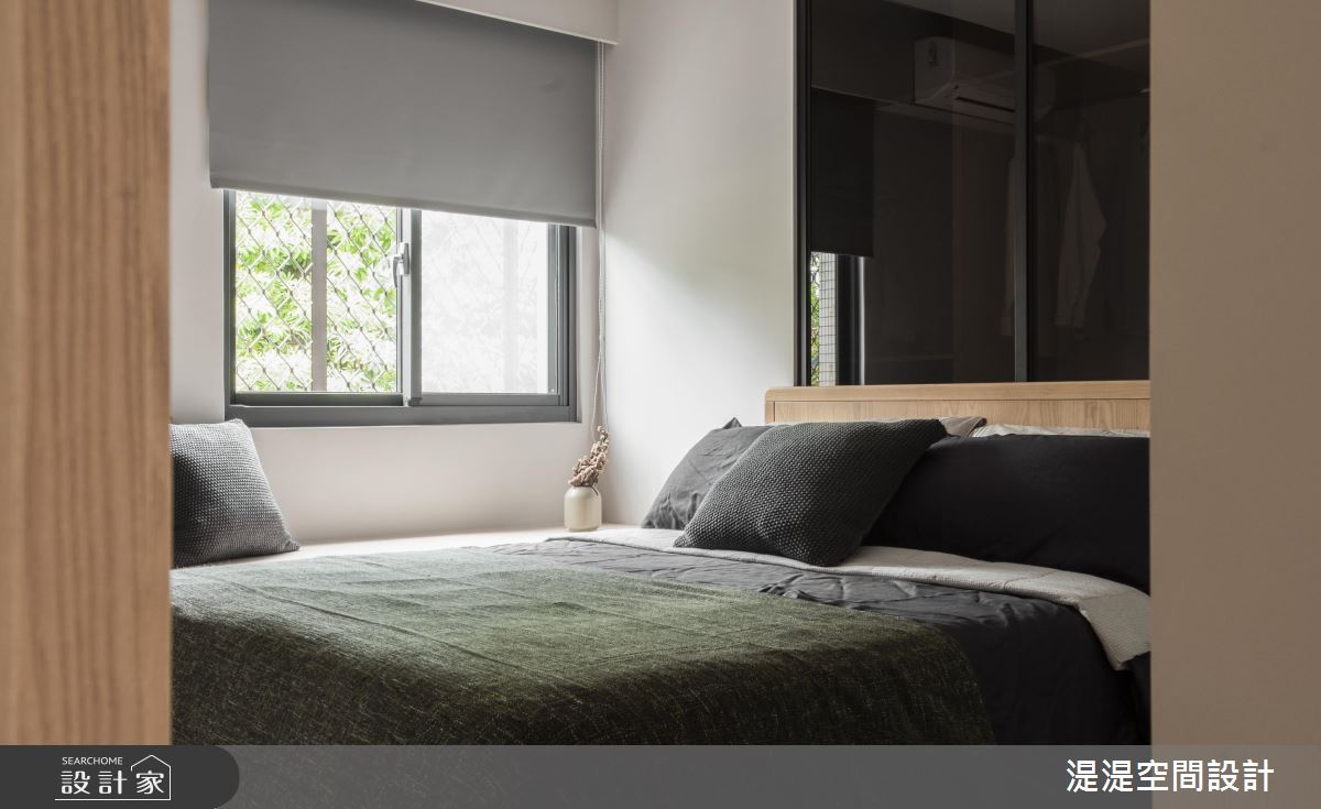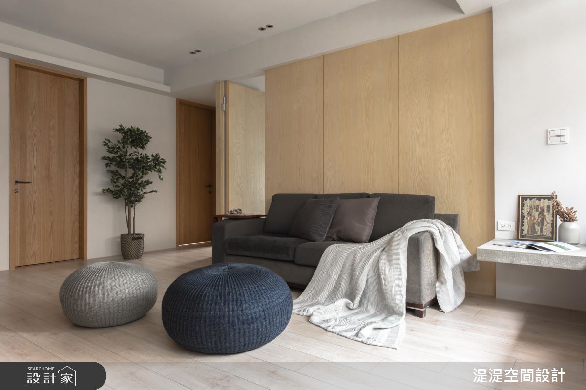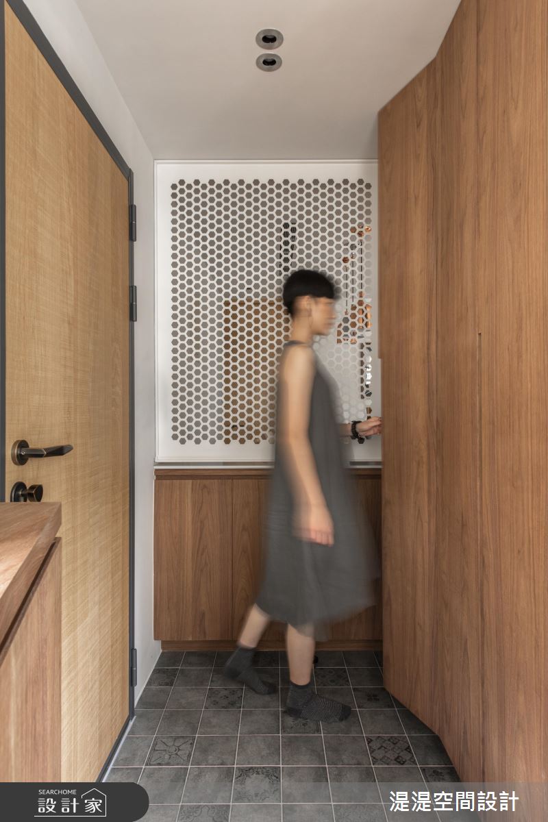 原始屋況中,由大門進入時即見客廳中心,僅以木作隔屏作為緩衝,造型玄關的收納機能不足,形成鞋盒、鞋子雜亂堆放的景況,且原始的沙發與電視的相對位置位於空間長向,使人坐在沙發上觀看電視的距離過遠;於是設計師透過格局改造,在入口處規畫頂天立地的鞋櫃,創造可收納約 60 雙鞋的空間,鞋櫃的背面同時兼做電視牆使用,不僅挹注大容量收納,更形成了玄關的最佳緩衝;轉進客廳,側邊亦安排矮櫃輔助鞋櫃收納,讓鞋子的總收納量可達約 80 雙鞋;而客廳的開窗側下方,更規劃了長達 4 米 5 的水泥臥榻,連接客廳沙發區及玄關,可作為邊桌與穿鞋椅使用,一舉兩得!
