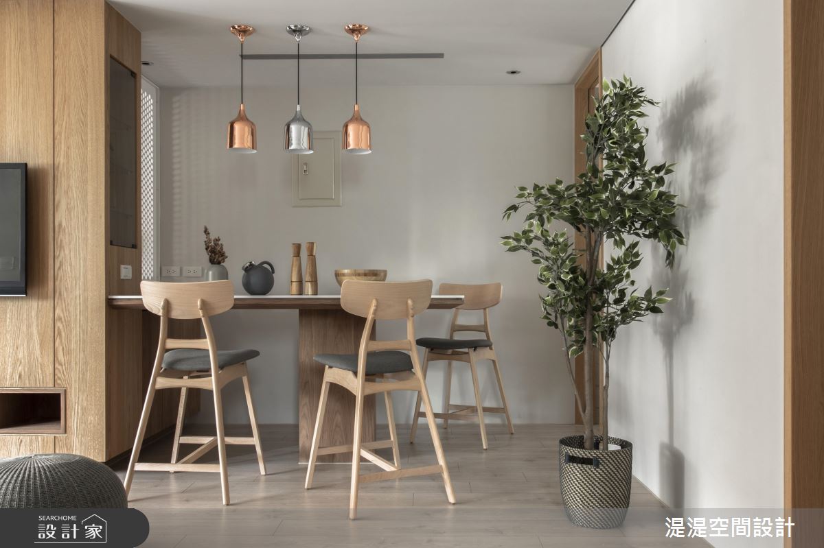餐桌中島則承襲著溫煦的木色,與電視牆量體相互串聯,在家中扮演著串連公共空間的核心角色!