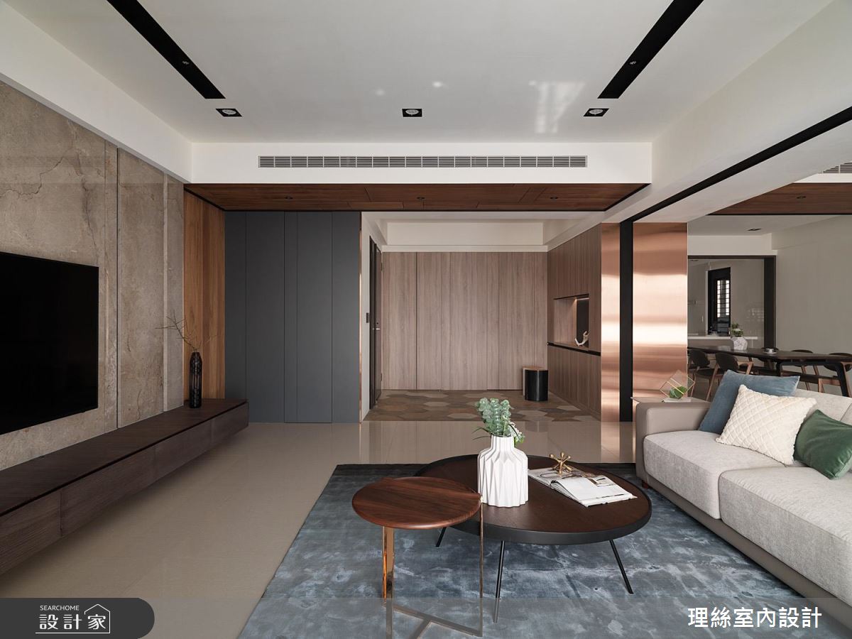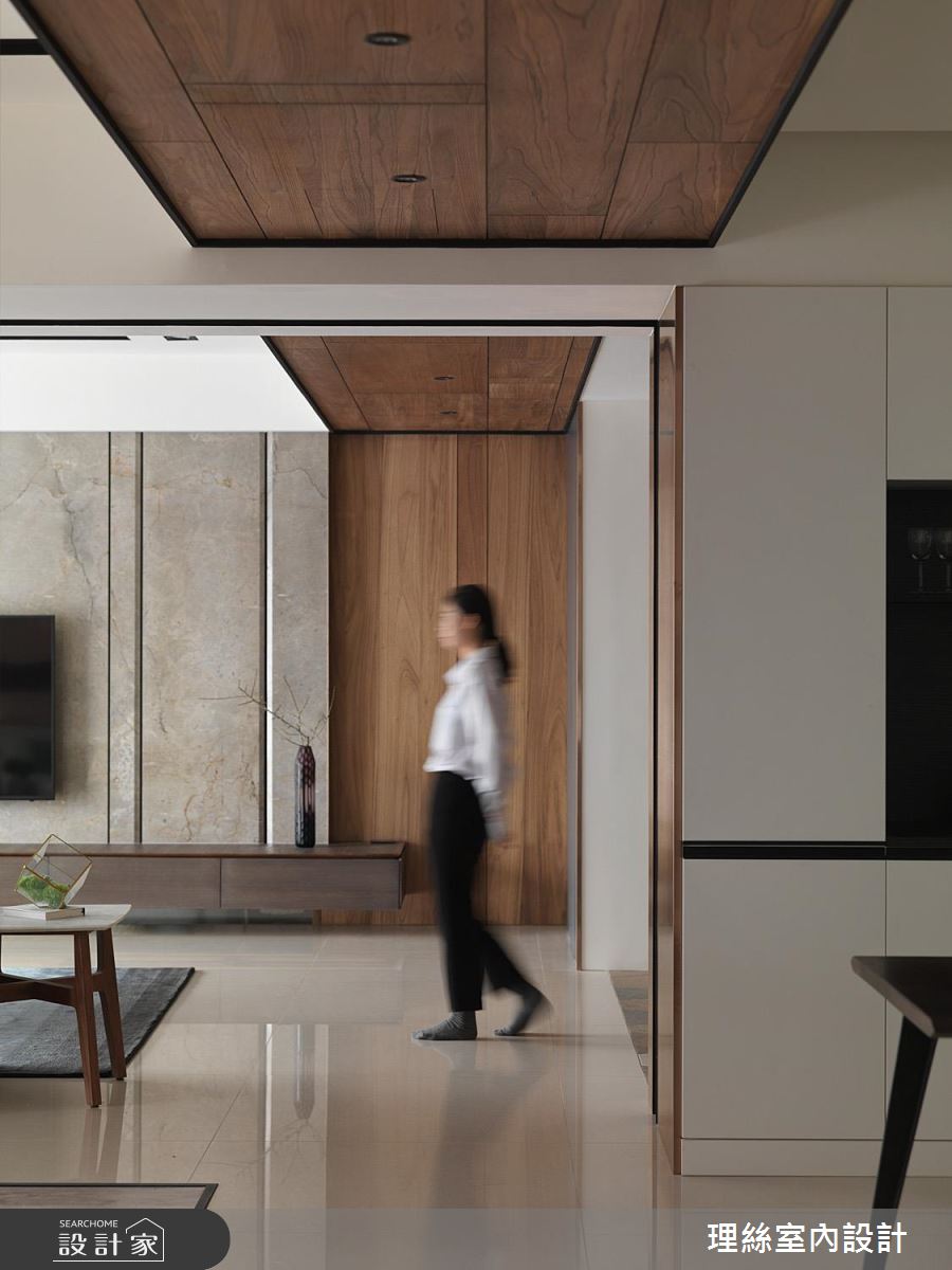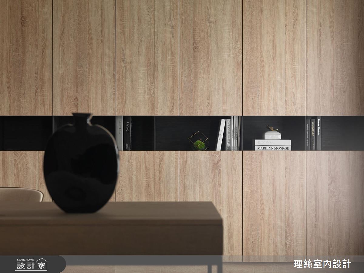 設計師將客廳後的既有隔間打除後,將天花板以框架概念作修飾,讓整體公共空間定位,增加場域深度,同時加大公領域範圍,打造開放式的閱讀書房,讓家人活動重心集中在公共場域,並梳理順暢動線,降低固定式裝修的比例,將固定式家具靠於兩側牆面,使活動更為自由,且讓日後空間可能隨著孩子成長做調整;材料選擇上,則考量到小孩年紀尚小,選用美耐板、系統板等,讓居家建材更為安心耐用,並適度混搭多元材質,如磚面、鐵件、鍍鈦板、灰玻等,讓材質層次更具變化,客廳主牆上則呈現含蓄的石紋肌理,搭配煙燻鋼刷實木皮,平衡整道牆面的協調畫面;收納上,則將儲藏室規劃在玄關入口,作為儲放露營用具的空間,並利用隱藏門設計、落實清爽俐落的收納表現!
