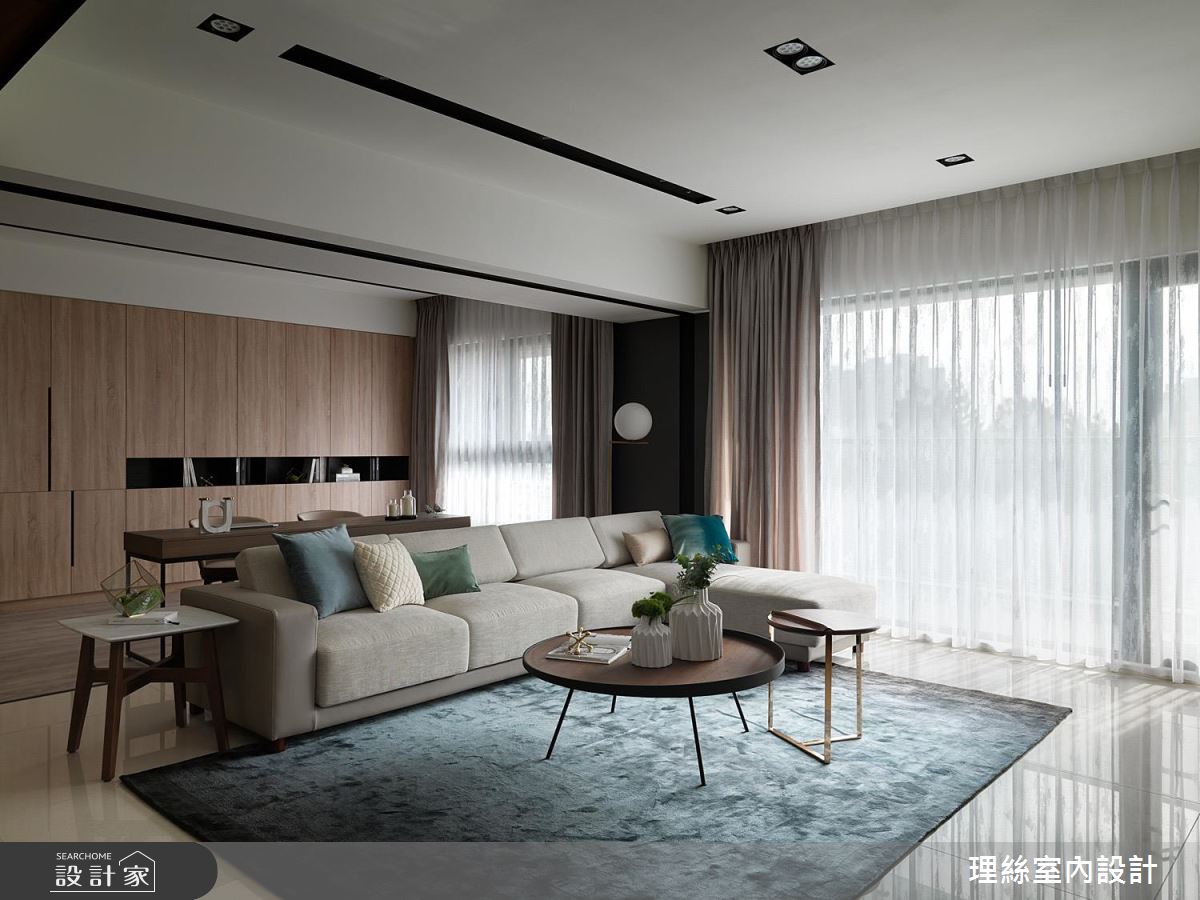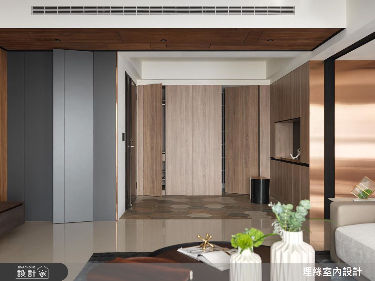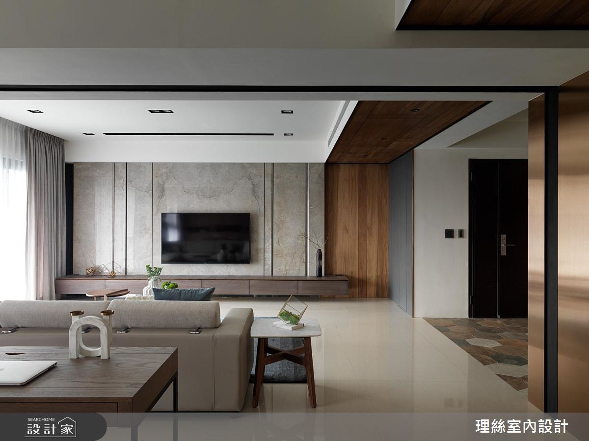 設計師將客廳後的既有隔間打除後,將天花板以框架概念作修飾,讓整體公共空間定位,增加場域深度,同時加大公領域範圍,打造開放式的閱讀書房,讓家人活動重心集中在公共場域,並梳理順暢動線,降低固定式裝修的比例,將固定式家具靠於兩側牆面,使活動更為自由,且讓日後空間可能隨著孩子成長做調整;材料選擇上,則考量到小孩年紀尚小,選用美耐板、系統板等,讓居家建材更為安心耐用,並適度混搭多元材質,如磚面、鐵件、鍍鈦板、灰玻等,讓材質層次更具變化,客廳主牆上則呈現含蓄的石紋肌理,搭配煙燻鋼刷實木皮,平衡整道牆面的協調畫面;收納上,則將儲藏室規劃在玄關入口,作為儲放露營用具的空間,並利用隱藏門設計、落實清爽俐落的收納表現!