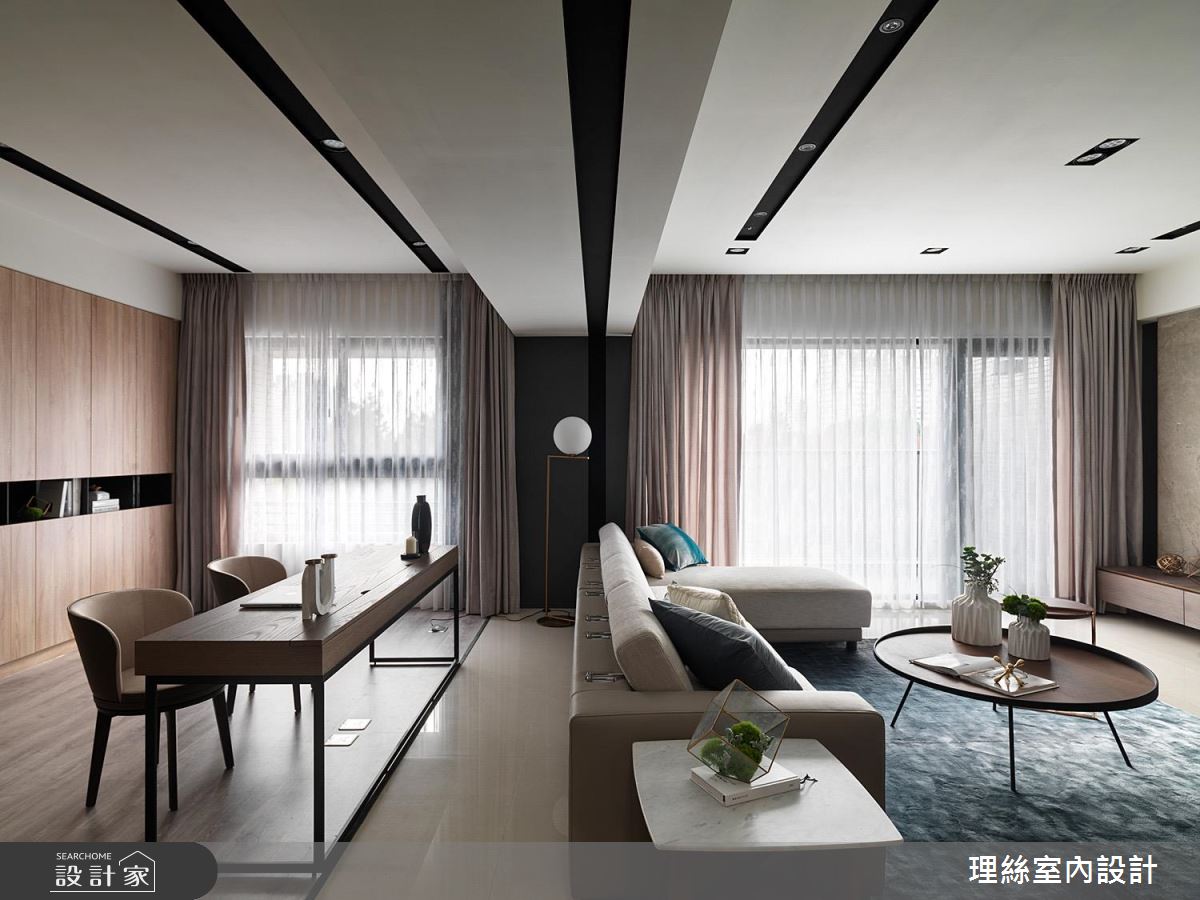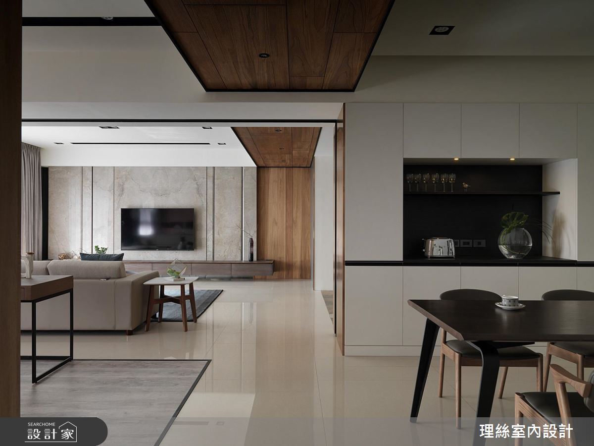 天花的大樑刻意添加了黑色線性溝槽,延伸空間寬度,並將相同元素延伸至餐廚區,利用框架線條做出領域界定並銜接場域風格!