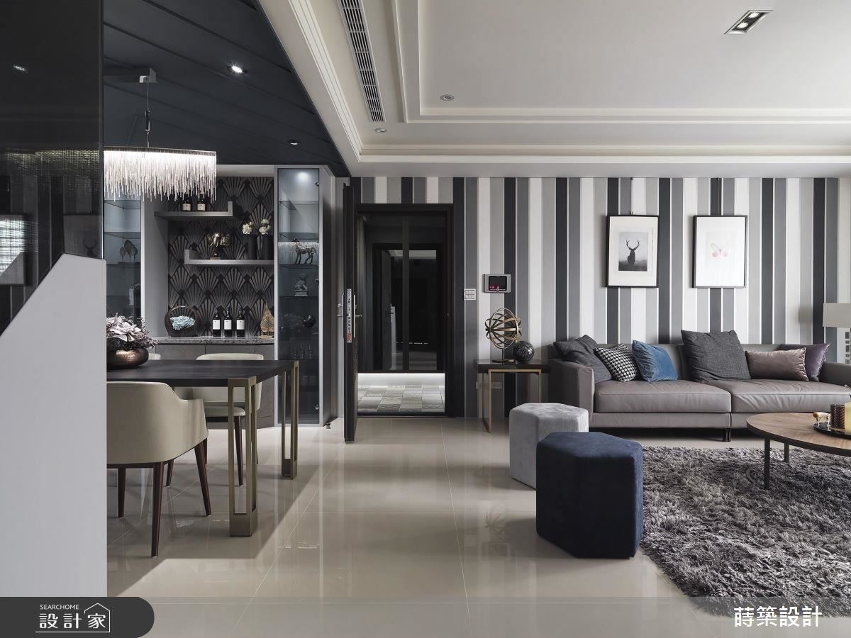 客廳壁面採交錯線條設計,營造俐落視覺層次。