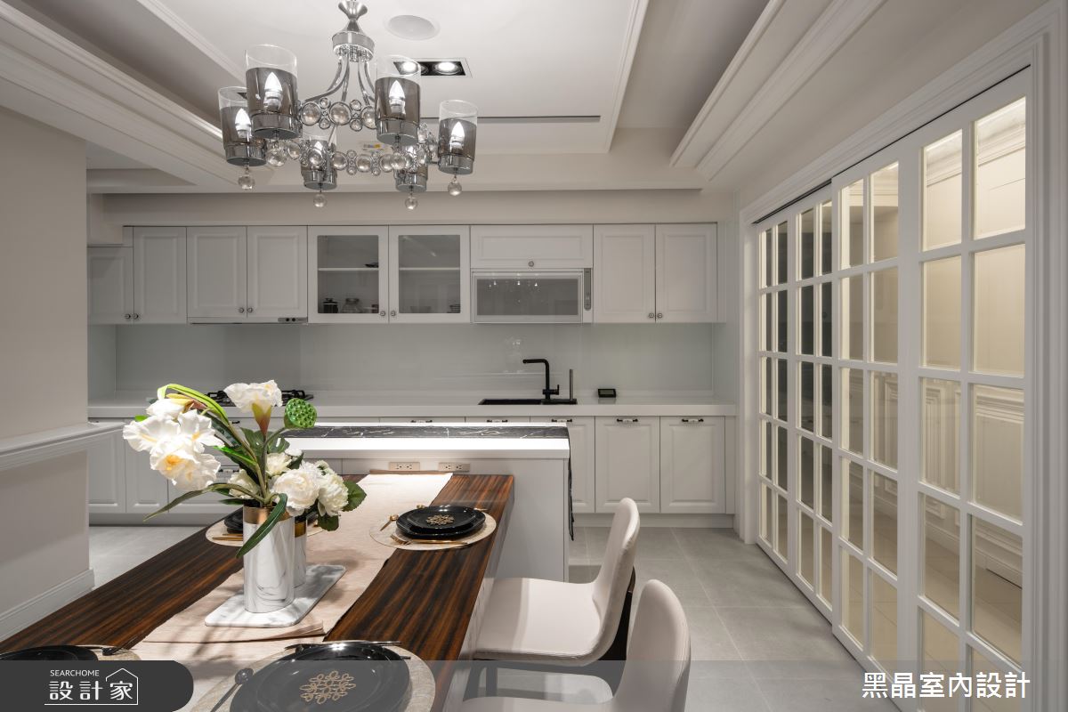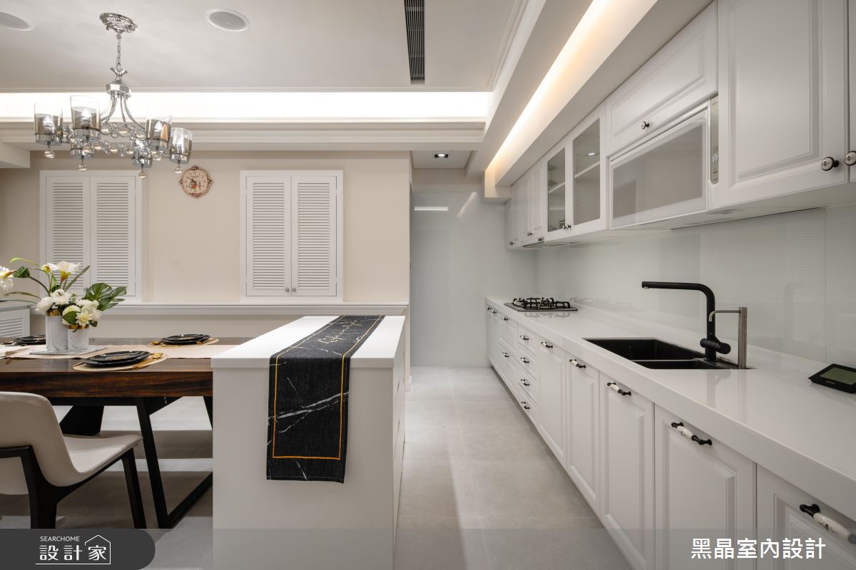 走進客廳,黑色大理石電視牆與純白線板對比之下,抓住視覺焦點,彰顯大器不失優雅的氣質,而高質感灰菱格沙發、色彩亮麗的家飾品,豐富空間層次;另一區破除傳統古典元素,選用輕木質調打造架高木平台,增添了隱形收納空間,宛如峇里島度假villa的發呆涼亭造型,成為談天放鬆的好去處。純白色獨立餐廚區,一字形廚房讓烹煮、備料、洗滌一條龍動線順暢,中島餐檯則為餐廚空間的轉圜地帶,替廚房及用餐機能加分。