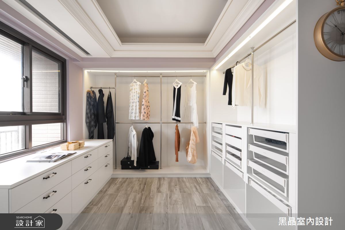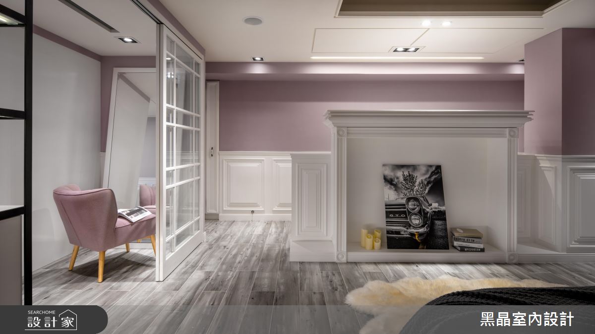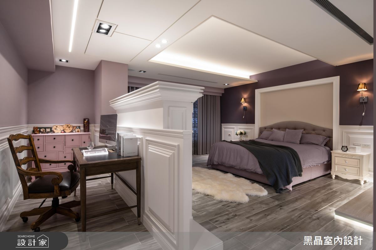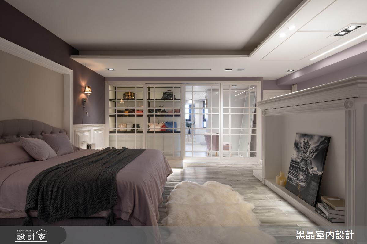 主臥高貴紫包覆的立面、對稱語彙的床頭設計、壁爐造型的電視牆隔間,傳遞沉穩神秘的華麗風格;收納層架特意以開放式呈現,便於收放物品外,擺上女主人的包包收藏,成為一面精品展示區高質感端景,一面落地穿衣鏡及粉色單椅,更完整了女人夢想中的更衣室樣貌。
