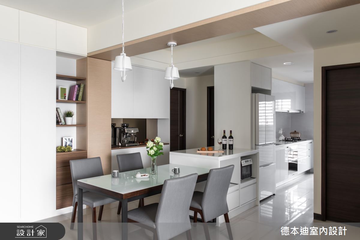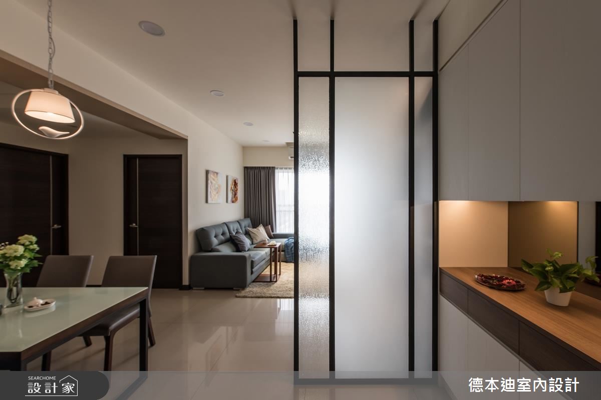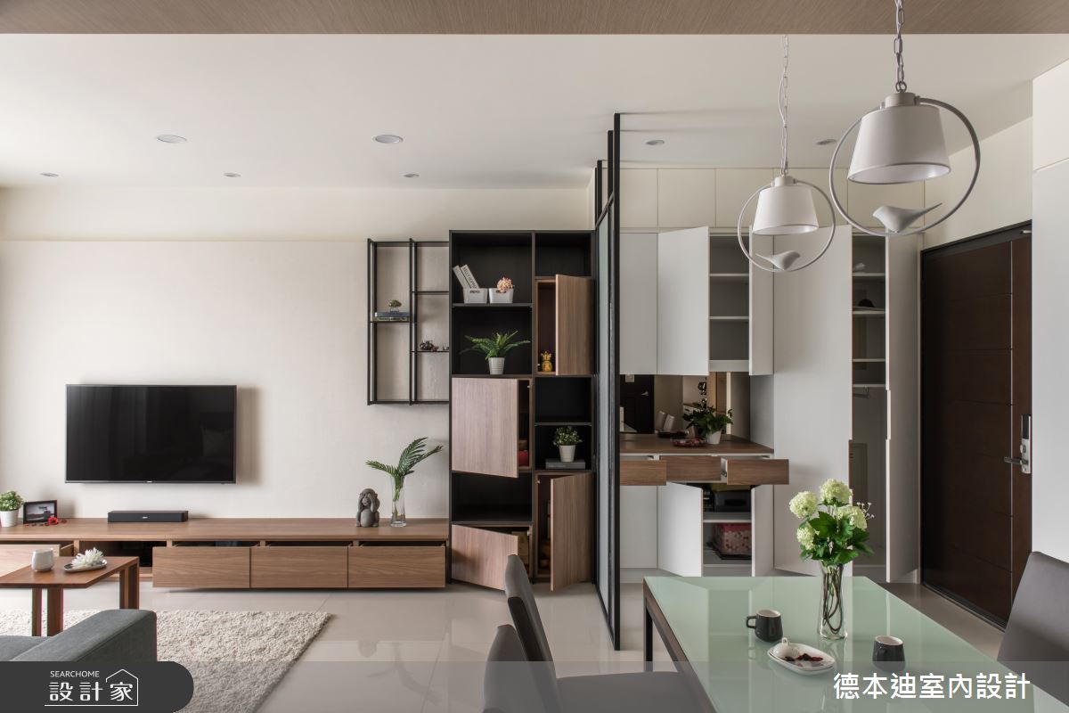 玄關處透過量體輕盈的鐵件屏風,搭佐帶有透光效果的玻璃,化解風水疑慮;為滿足大容量收納需求,鞋櫃及公共空間運用大量系統櫃,井然有序地分割線條、部分溫潤木作及鐵藝的穿插,一次兼顧了造型、收納並減輕沉重視覺。廚房及餐桌之間,增加中島以劃分清晰順暢的生活動線,也為廚房電器設備增加順手收納空間;上方大樑以木質包覆化解突兀感,垂降的懸吊造型燈,輕巧點綴了空間特色。