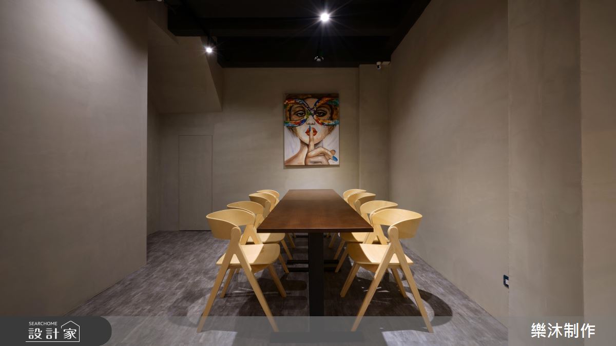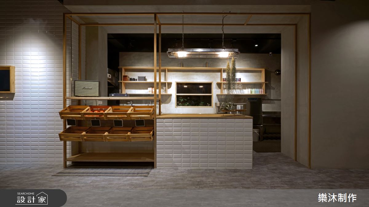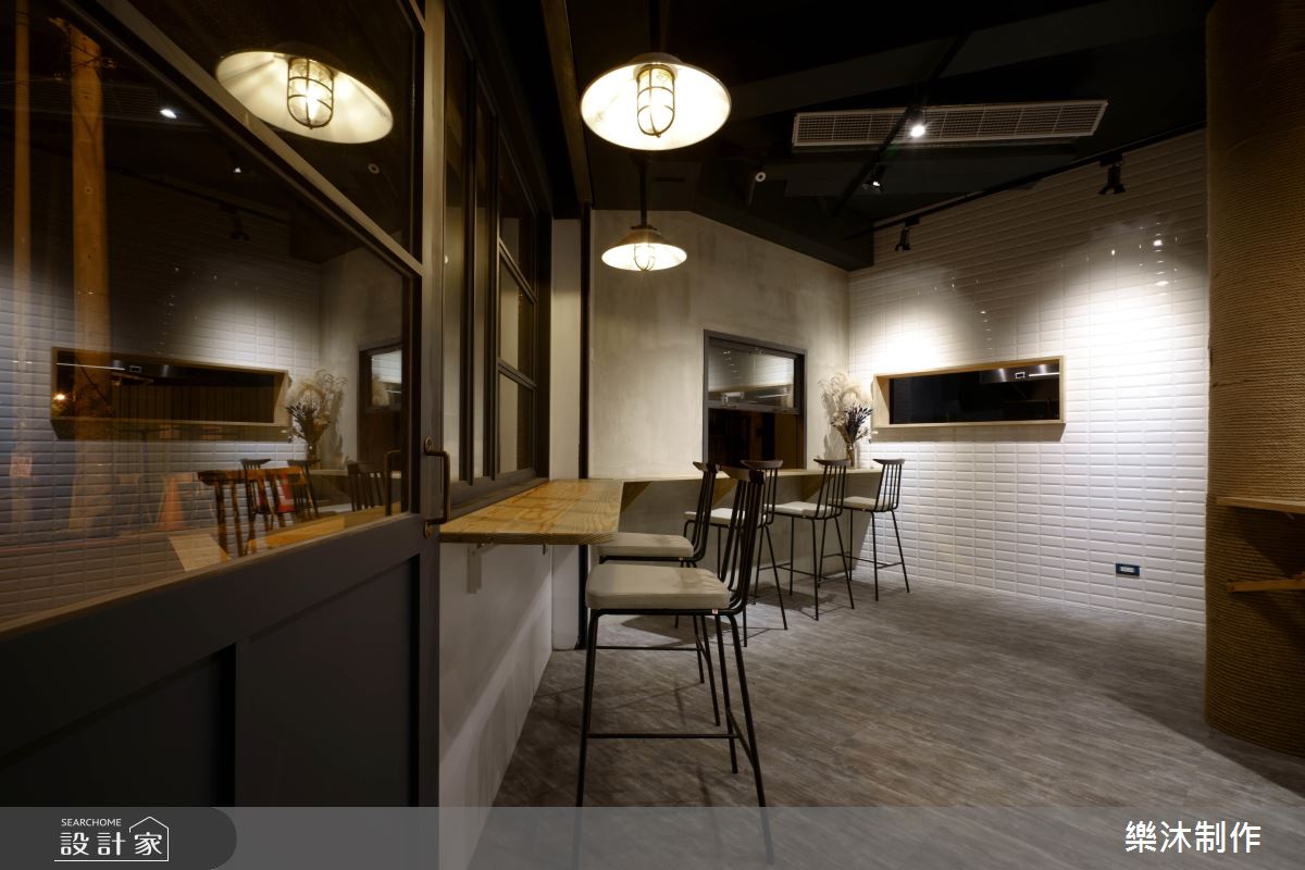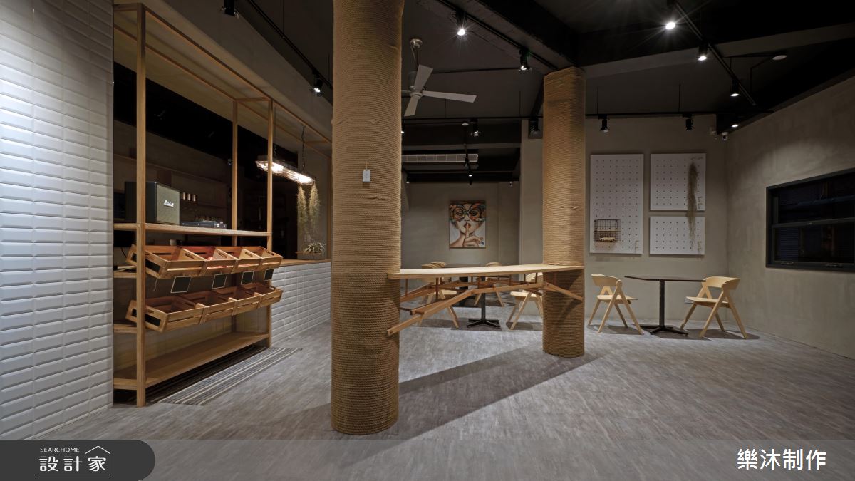 簡約的白色牆,搭配深咖啡色系木作結合玻璃材質,替建築外觀寫下一份耐人尋味的復古色彩。天花板漆上黑色調,軌道燈遊走其中,讓天際更顯寬敞挑高;仿水泥質感的壁面環繞一室,木紋鋪陳室內地坪,伴隨大地色系的家具與造型邊框、結構柱環繞麻繩的方式,替空間注入溫馨暖調;入口臨窗處架高木作吧檯區,並搭配鐵件吊燈,營造出露天咖啡廳味道;櫃台區透過磚牆造型與木作設計,營造出清新、愜意的氛圍,而木紋肌理勾勒的開放層架與櫃體,則呼應北歐風的自然無華;內部座位區提供8人座位,滿足家族或多人聚餐的需求,牆上的人物風格畫作替樸質的空間注入藝術活水,趣味盎然。