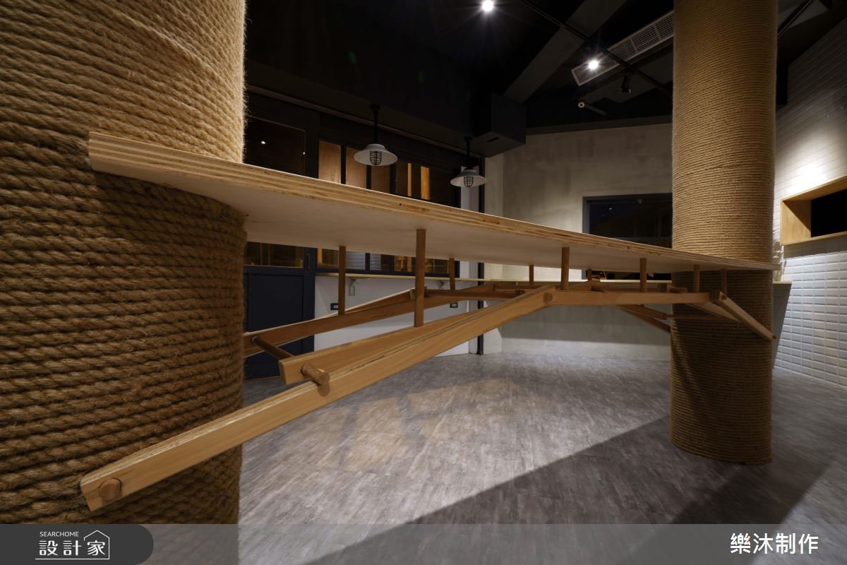 空間的中央巧遇兩大柱體,將麻繩環繞其中,並透過木作卡接的方式撐起桌面,滿足機能與視覺美感。