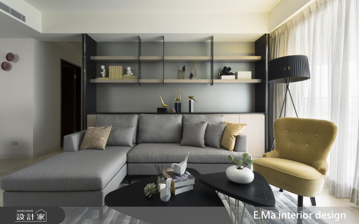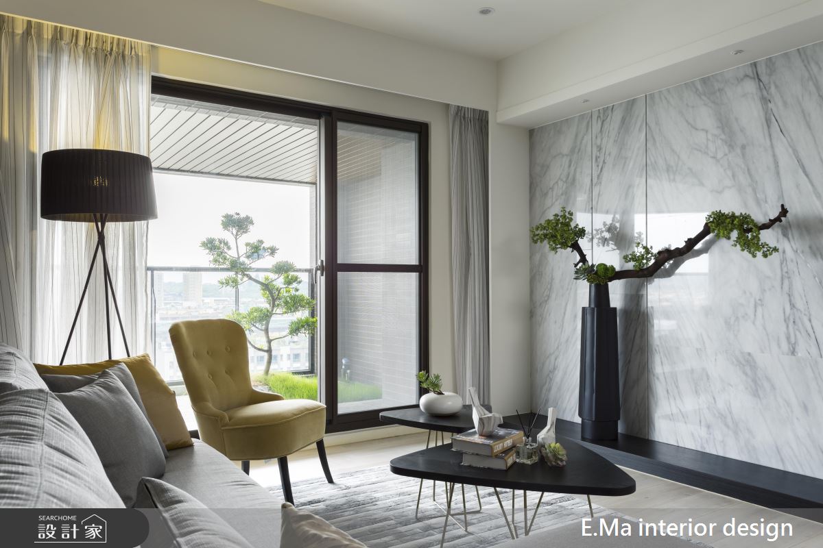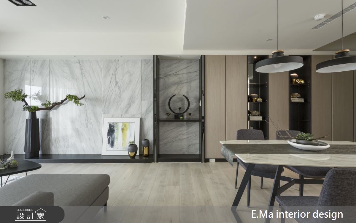 公領域以開放式的設計,讓室內動線清晰無阻隔,同時援引陽台的綠景入內,提升居家的自然風光。客廳的沙發背牆妝點淡淡的灰色,以層板規劃展示空間,並在櫃體邊緣裝飾鏡面,減輕立面的視覺重量。而電視牆藉由雪白的大理石材質,增添空間的優雅感受,同時與灰色牆面形成對比,協調出宜人的生活氣息。
