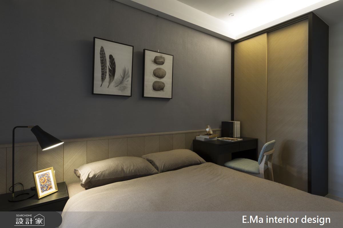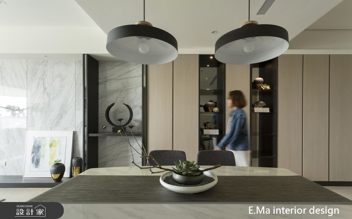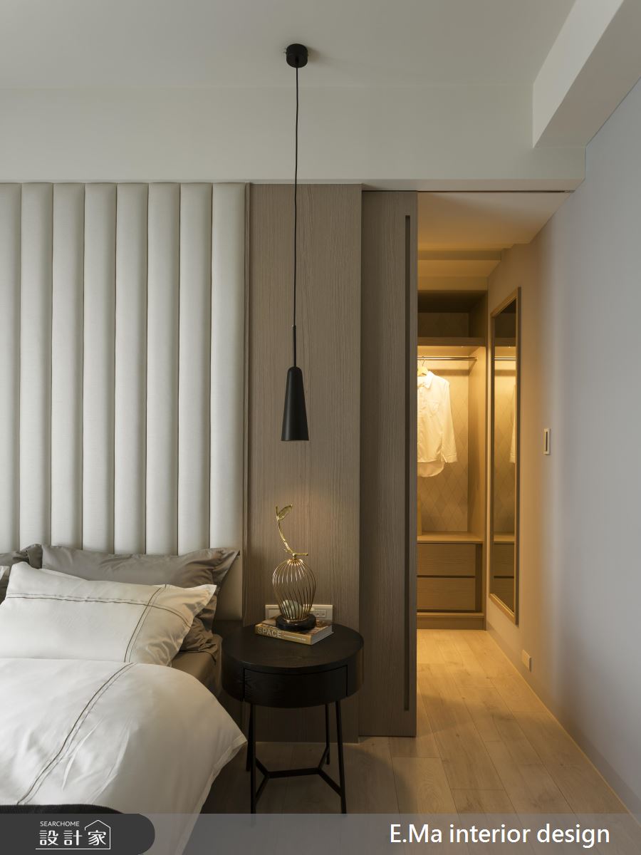 設計師在玄關延伸到餐廳的收納櫃之中,安排了兩道鏡面襯底的展示空間,除了賦予室內豐富的機能變化,也點亮居家的整體氛圍。主臥則透過純白繃布搭配質感木紋,讓立面顯得溫暖舒適,同時藉由一道拉門隱藏後方的更衣室,讓屋主能擁有悠閒自在的穿搭時光。