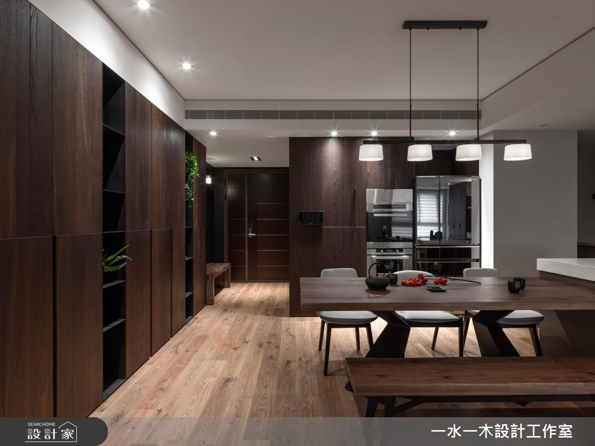 室內自玄關開始,原木質地從地板、桌椅拓展到大面積的櫃體,讓人被溫暖的自然氣息緊緊包圍。客廳和書房援引一整片的採光,搭配帶有成熟氣質的家具,讓整體呈現寬敞大氣的氛圍。公領域的收納融入於牆面中,讓一家人的生活動線不受到影響,而木紋的溫潤結合鐵件的冷冽,則互補出具有變化的立面形象。