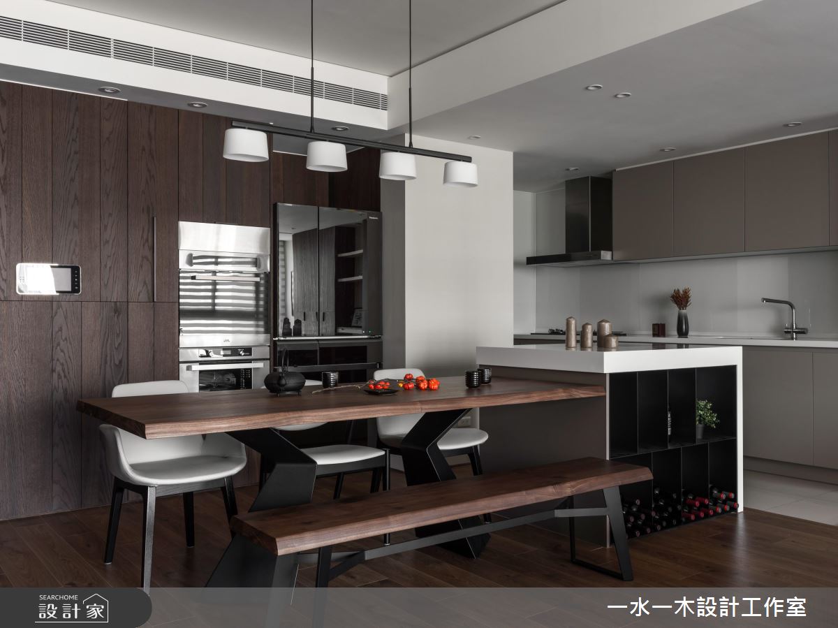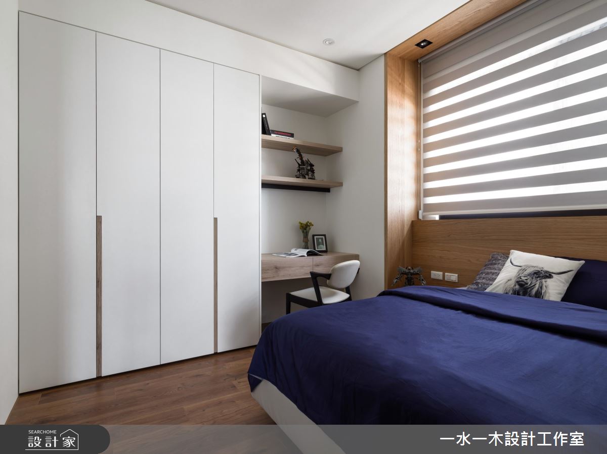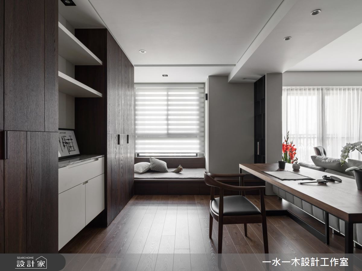 餐廚空間選擇開放式設計,並將深木色餐桌與大理石吧檯整併,創造中西合璧的舒適用餐環境,全家人聚在一起自在不擁擠。主臥藉由深色床頭牆,搭配兩面充足的收納櫃,表現如屋主般穩重的空間性格,同時兼具豐富機能性。次臥在開窗處以木紋飾牆,並在柔和日光的照射下,規劃供人靜靜閱讀的書桌。