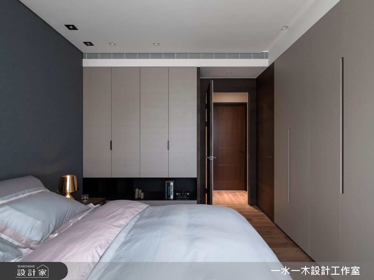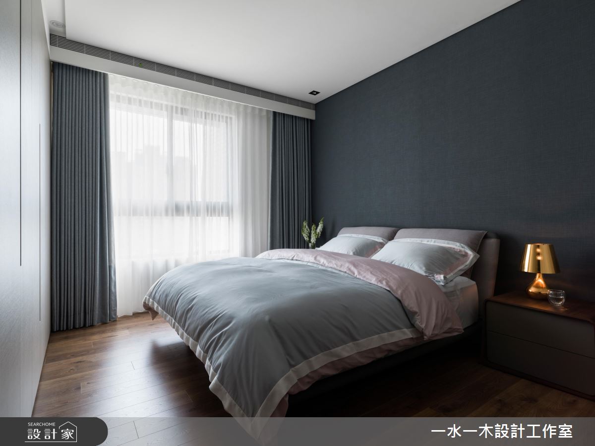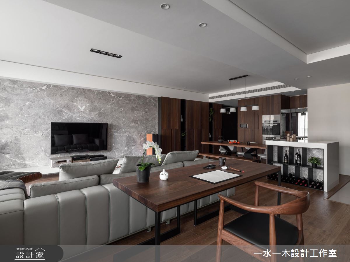 餐廚空間選擇開放式設計,並將深木色餐桌與大理石吧檯整併,創造中西合璧的舒適用餐環境,全家人聚在一起自在不擁擠。主臥藉由深色床頭牆,搭配兩面充足的收納櫃,表現如屋主般穩重的空間性格,同時兼具豐富機能性。次臥在開窗處以木紋飾牆,並在柔和日光的照射下,規劃供人靜靜閱讀的書桌。