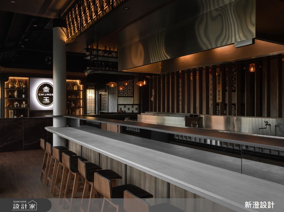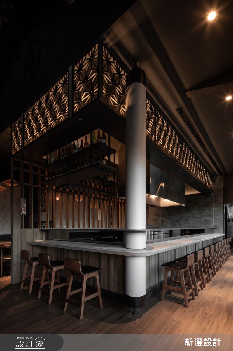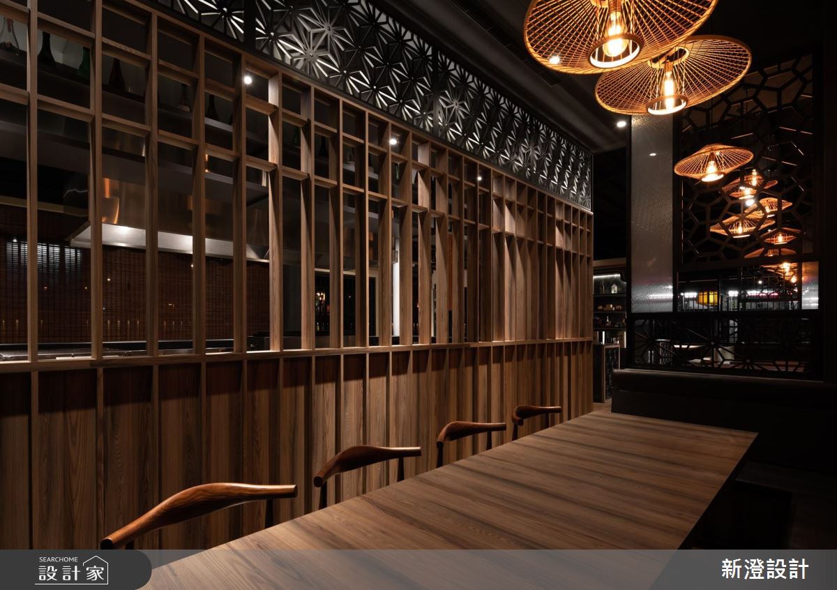 木紋地板鋪陳一室,天花板以簡約、無刻意裝潢的黑色調襯底,成功拉高天際線,讓空間更顯寬敞大器,軌道燈串連其中,與室內部分的風格燈飾相互調和,營造出濃濃的日系和風情境,讓人踏進空間裡隨時感受平和、靜謐之感;吧檯上方以古典味的窗櫺妝點並環繞其中,燈光穿透鏤空孔縫,醞釀一抹幽靜的氣息;空間裡透過木作造型格柵、復古造型的窗櫺界定不同主題的座位區,開放空間裡隨著竹編、飛碟狀的吊燈懸掛其中,擦亮幽暗的視覺,增添一抹日式的雅緻氛圍。