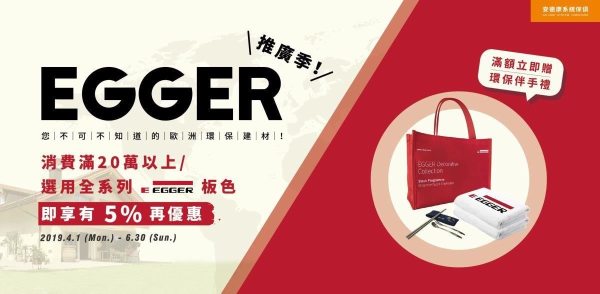 為了讓更多人感受 EGGER 板材的優異,從 4/1 至 6/30 日,只要在安德康簽約滿 20 萬元以上,就能享有 EGGER 全色系板材 5% 優惠,並贈送環保伴手禮:EGGER 環保提袋、EGGER 棉紗毛巾、不鏽鋼環保餐具組 x2 組,活動詳細說明請見官網。想了解 EGGER 板材的與眾不同嗎?歡迎到全台五大門市親眼看看,親手挑選。