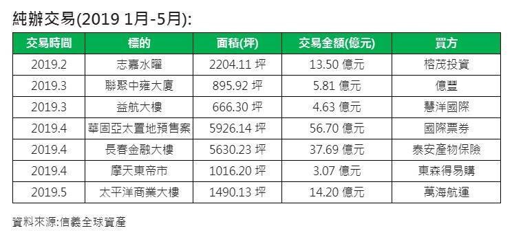 以今年1月~5月已有7筆純辦大樓交易,累計金額約135.6億元,對比前幾年同期交易量,2019年純辦大樓明顯量增,包括國際票券、泰安產險、萬海航運等公司都購入大面積辦公室作為未來總部辦公使用。自用型買方持續投入商用不動產,從去年到現在可以觀察到,大型企業選擇精華地段做總部使用持續升溫。